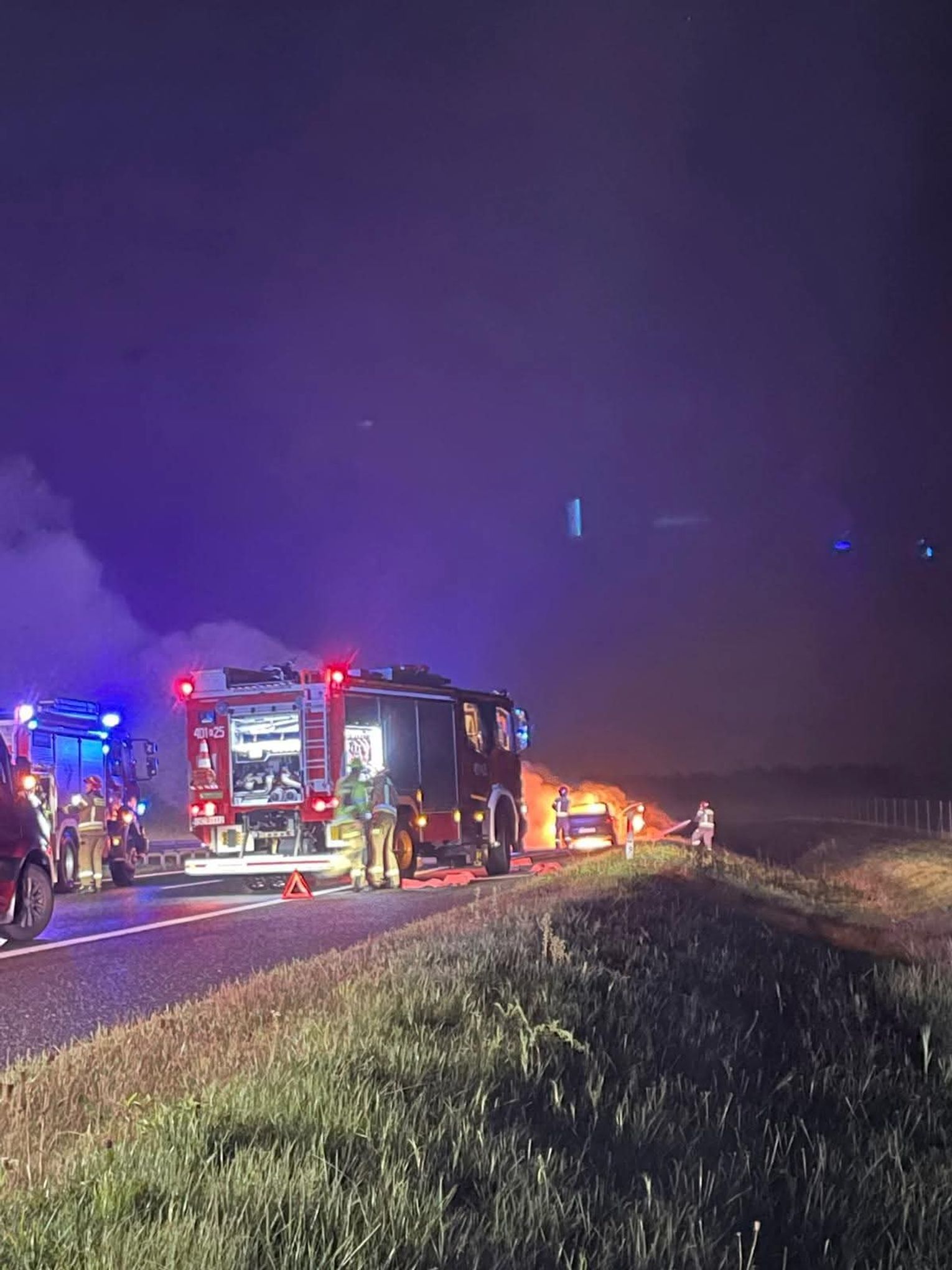 Na miejsce zdarzenia natychmiast zadysponowano zastępy straży pożarnej, funkcjonariuszy policji oraz służby zarządzające autostradą. Priorytetem było zabezpieczenie terenu i ugaszenie płonącego pojazdu.