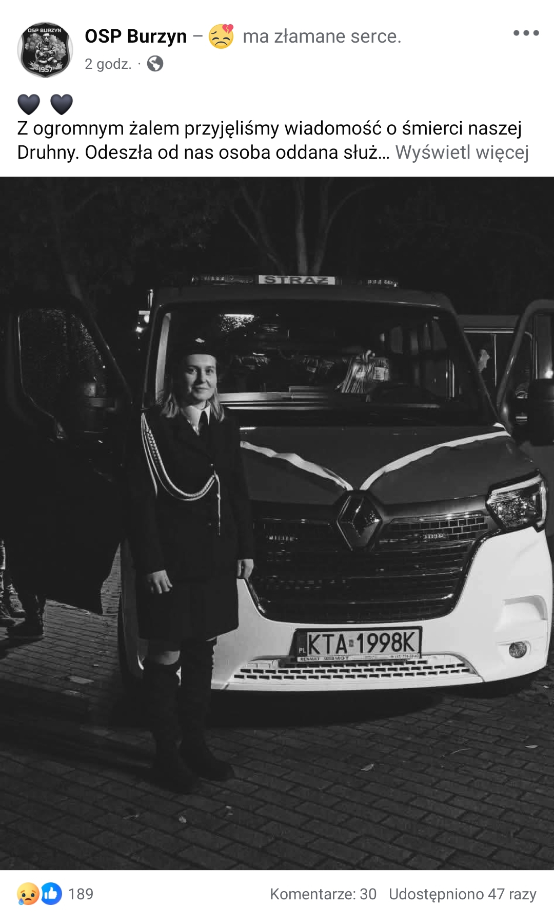 - Z ogromnym żalem przyjęliśmy wiadomość o śmierci naszej Druhny. Odeszła od nas osoba oddana służbie, pełna pasji, serdeczności i gotowości do niesienia pomocy drugiemu człowiekowi. Jej zaangażowanie i poświęcenie pozostaną na zawsze w naszej pamięci. Była nie tylko strażaczką – była częścią naszej strażackiej rodziny. Rodzinie, Bliskim i Przyjaciołom składamy najszczersze wyrazy współczucia. Spoczywaj w pokoju, Druhno. Cześć Jej pamięci - czytamy we wzruszającym wpisie na profilu OSP Burzyn.