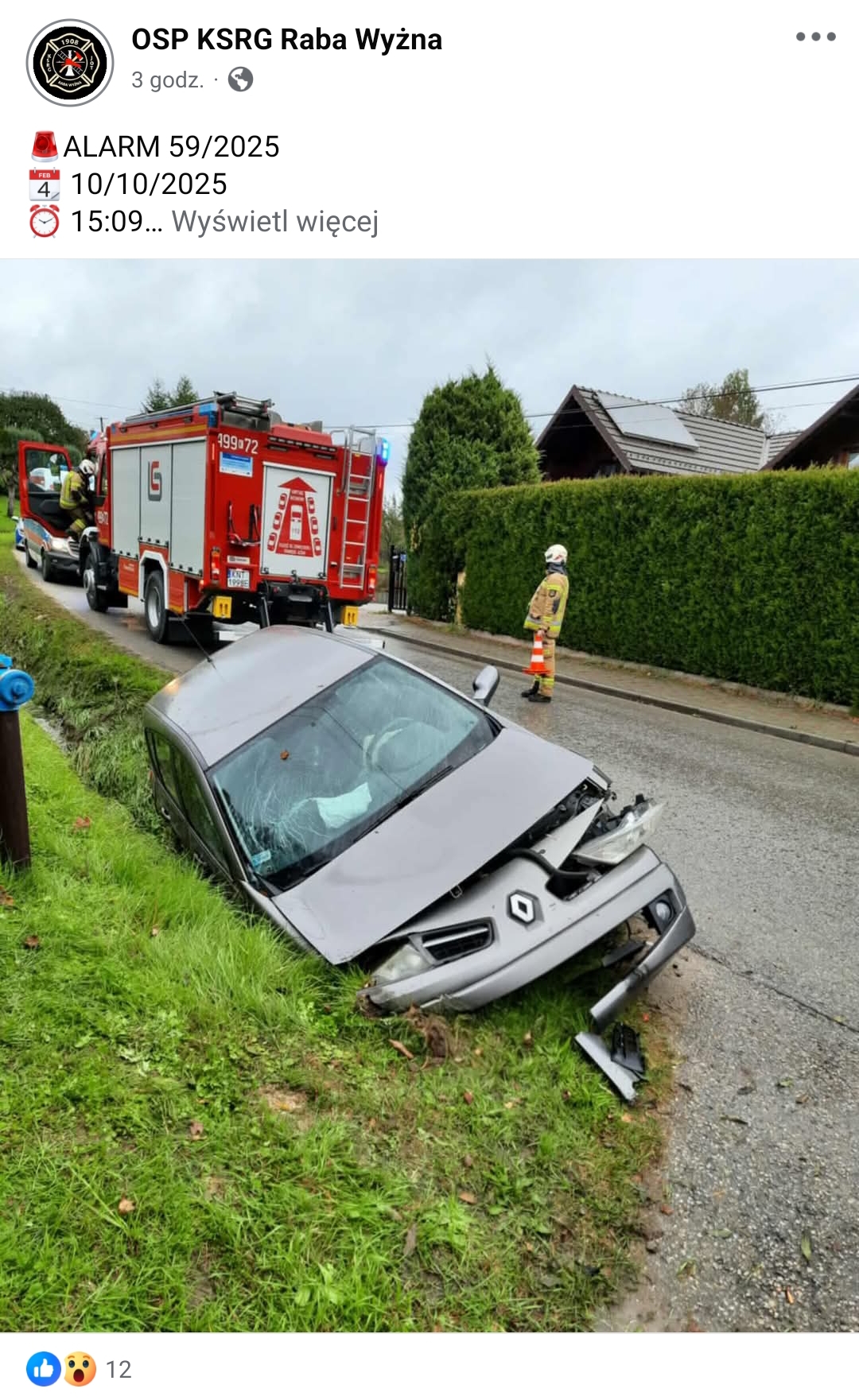 W piątkowe popołudnie 10 października o godzinie 15:09 służby ratunkowe zostały zadysponowane do zdarzenia drogowego na terenie Raby Wyżnej, miejscowości położonej w powiecie nowotarskim. Wstępne okoliczności wskazują, że kierowca samochodu osobowego prawdopodobnie nie dostosował prędkości do warunków panujących na drodze, wypadając z jezdni i lądując przydrożnym rowie.