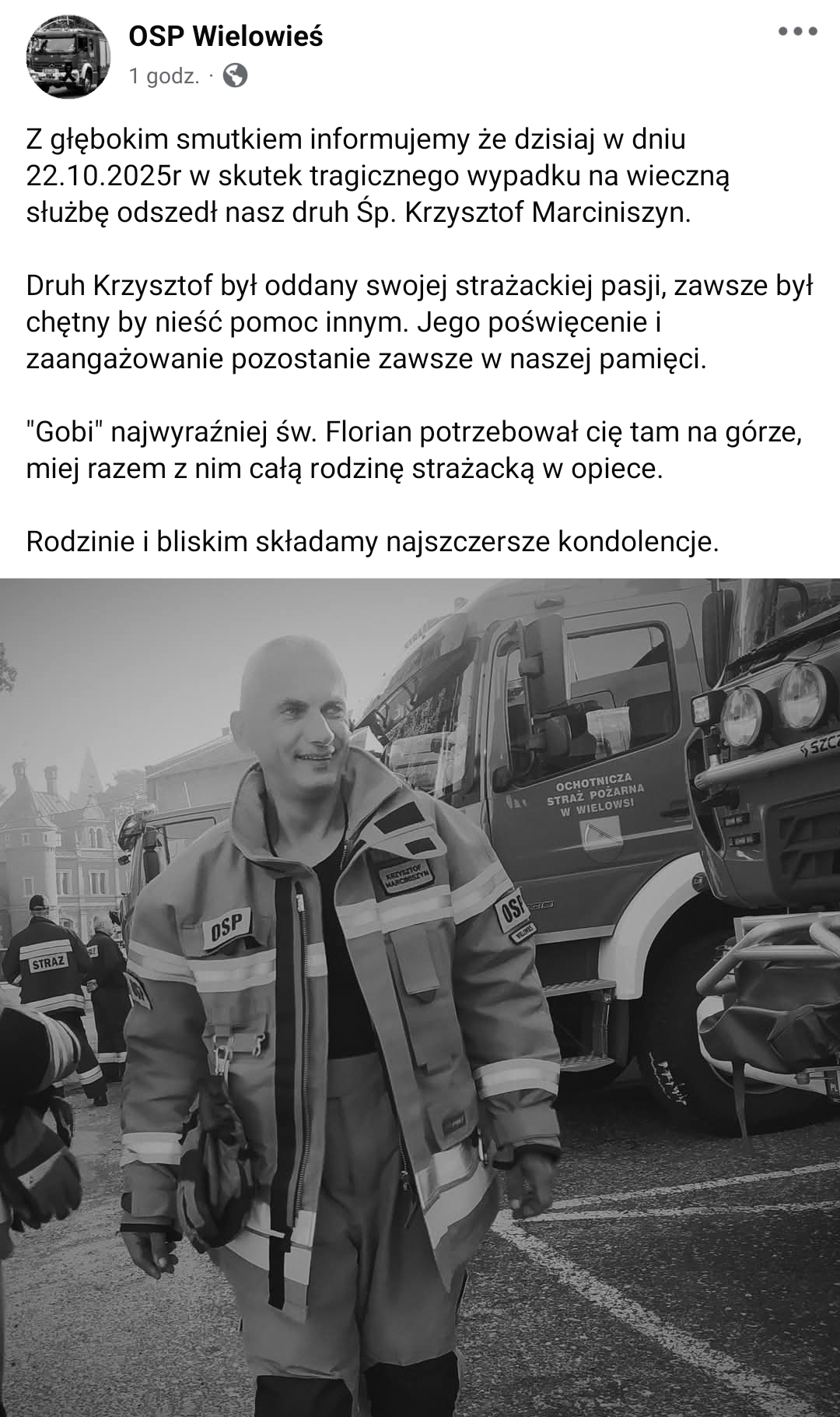 „Z ogromnym smutkiem informujemy o śmierci naszego kolegi – druha Krzysztofa Marciniszyna z OSP Wielowieś. Był czołowym kierowcą jednostki, niezawodnym druhem i dobrym człowiekiem” – przekazała Gmina Wielowieś, wyrażając współczucie dla rodziny i bliskich zmarłego.