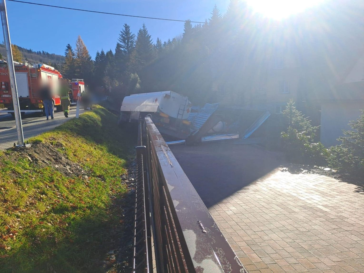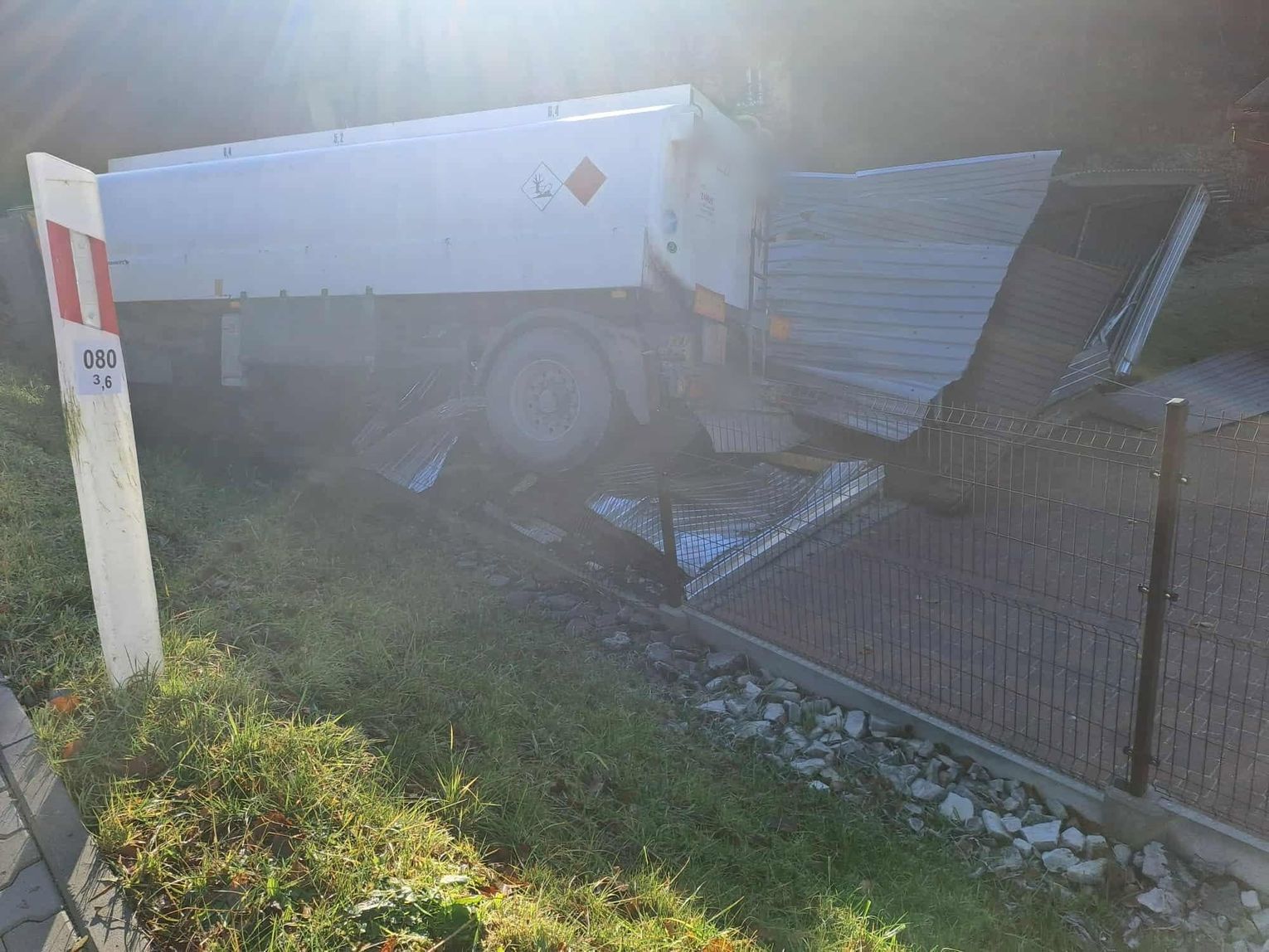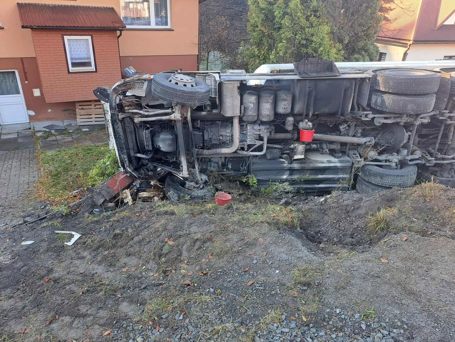 Według wstępnych ustaleń służb, siła zderzenia była na tyle duża, że pojazd ciężarowy stracił stabilność, wypadł poza drogę i wywrócił się na bok. Niestety, znalazł się on bezpośrednio nad zaparkowanym samochodem osobowym, który znajdował się w przyległym do posesji garażu, doszczętnie go niszcząc.