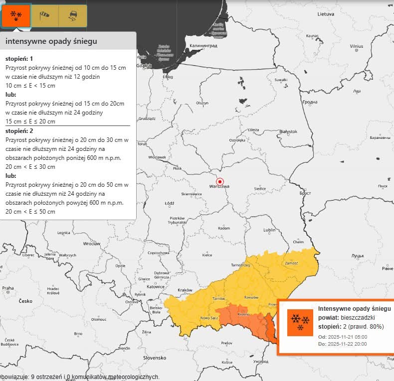 Najpoważniejsze, drugiego stopnia ostrzeżenie meteorologiczne, zostało ogłoszone dla powiatu gorlickiego. Alert ten wchodzi w życie w piątek, 21 listopada, o godzinie 05:00 i ma obowiązywać do godziny 20:00 w sobotę, 22 listopada. Synoptycy ostrzegają, że w tym rejonie opady śniegu będą miały natężenie umiarkowane, a momentami silne.