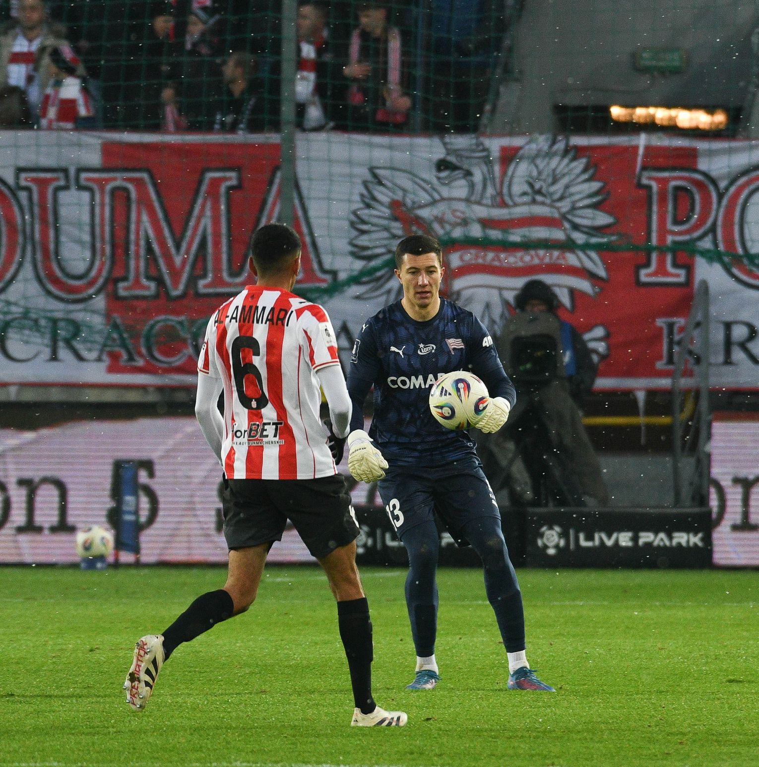 Początek spotkania pokazał, że obie drużyny miały zamiar grać ofensywnie i dążyć do dominacji, jednak w pierwszej połowie przeważała ostrożność. Akcje budowane były mozolnie, a priorytetem wydawało się unikanie błędów. Cracovia liczyła na błyskotliwe kontrataki, w których siłą napędową miał być szybki Filip Stojilković, choć przy jednym z rajdów zgubił piłkę. Odnotować można strzał z woleja Mateusza Klicha po rzucie rożnym i próbę ataku gości, gdzie uderzenie Karola Czubaka zostało zablokowane przez Al-Ammariego. Niestety, pierwsza odsłona meczu szczególnie rozczarowała pod kątem celności – Cracovia nie oddała ani jednego celnego strzału, podczas gdy goście mieli dwie takie próby.
