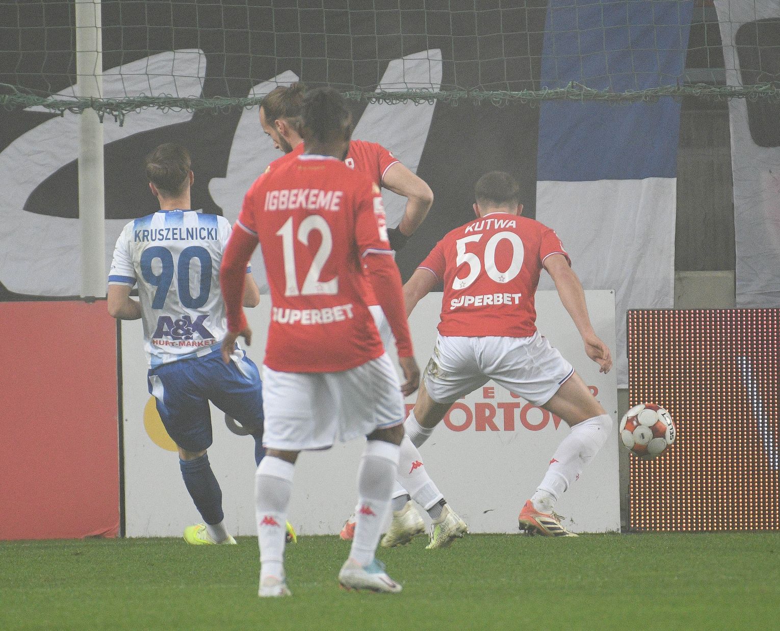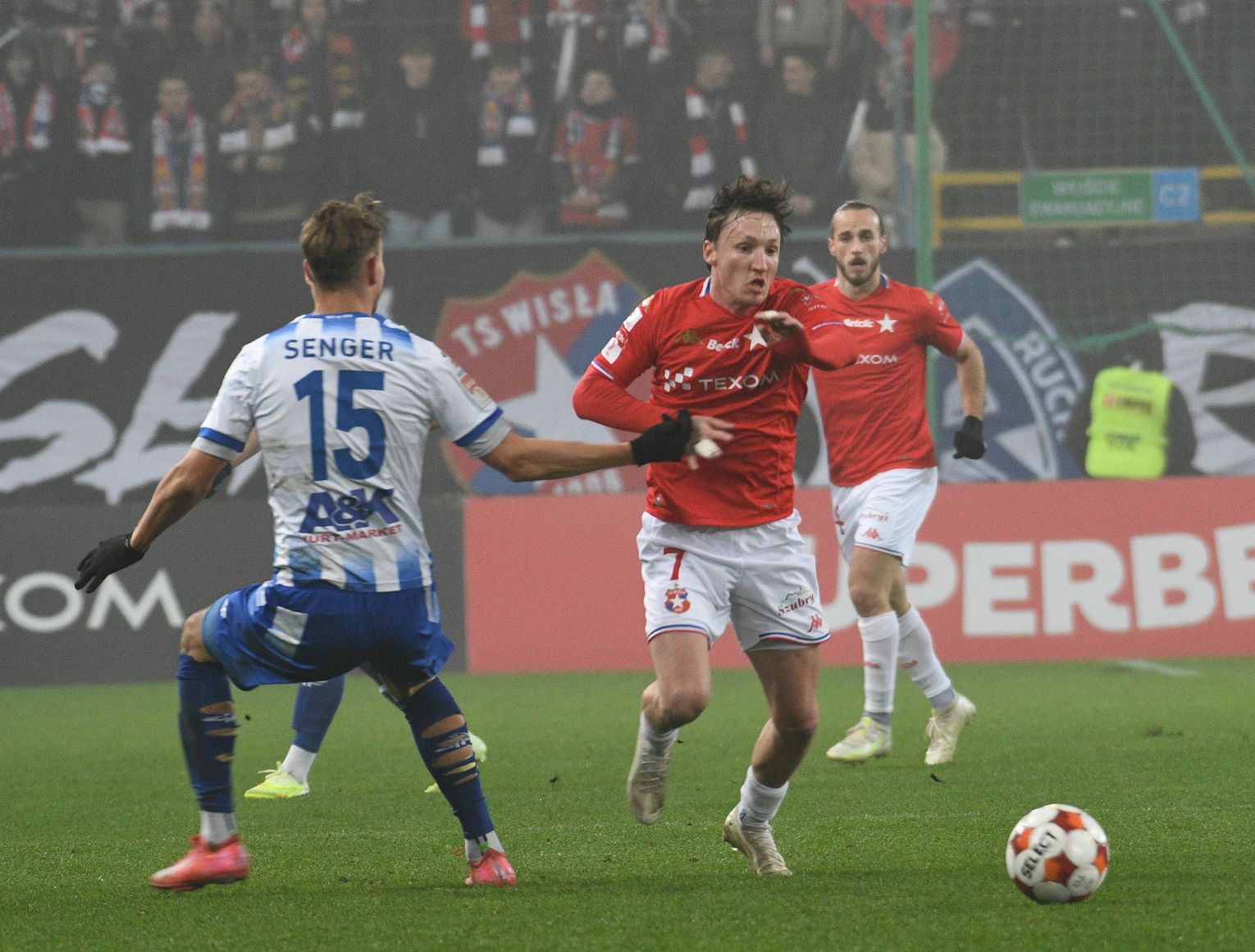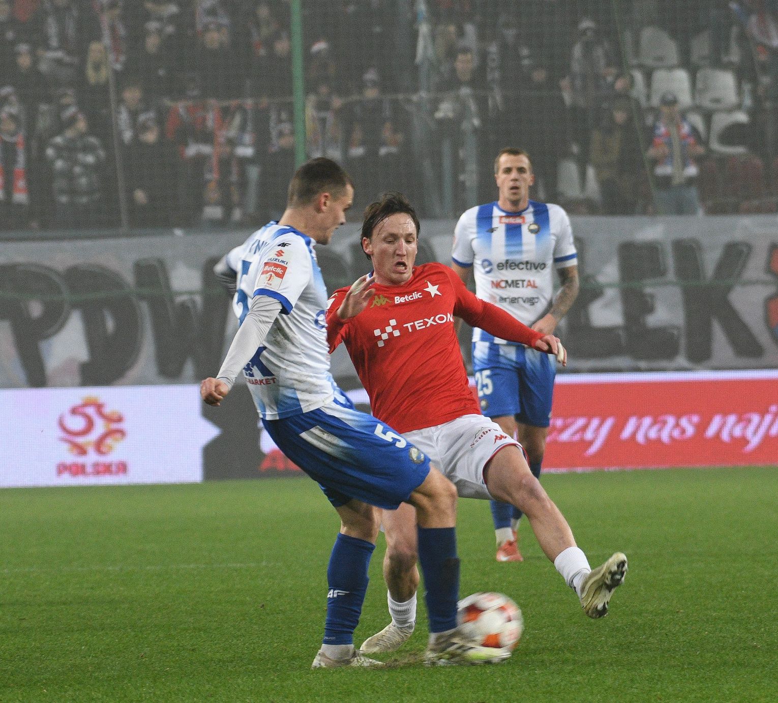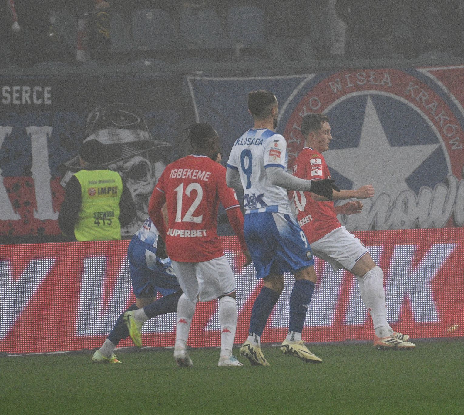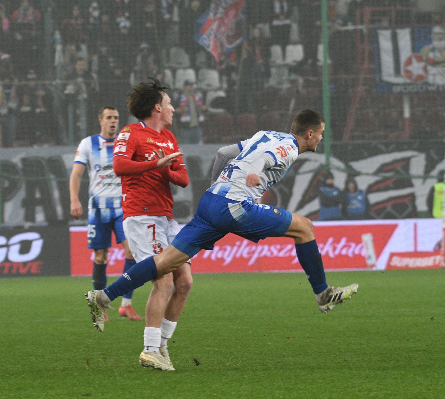 Defensywa gości pękła w 28. minucie. Po serii dynamicznych ataków Wisły, wynik na 1:0 otworzył Kacper Duda. Pomocnik wykorzystał precyzyjne podanie od Marko Bozicia, pokonując Matysa płaskim strzałem. Ten gol wyraźnie dodał wiatru w żagle krakowianom, którzy błyskawicznie podwyższyli prowadzenie.