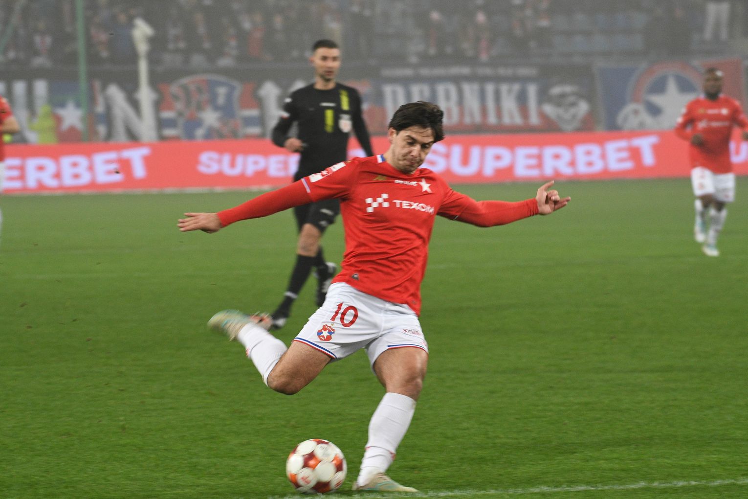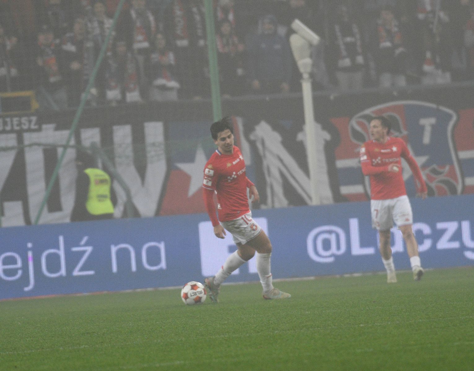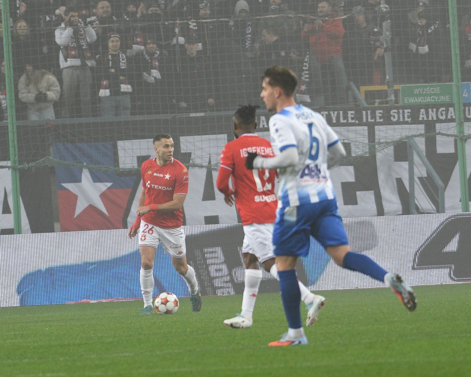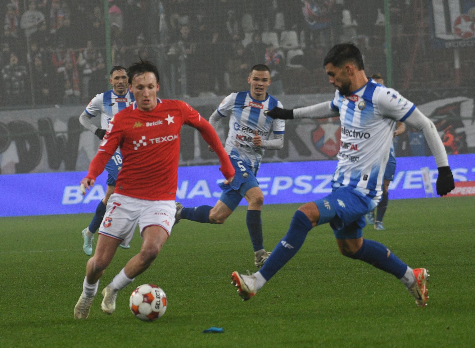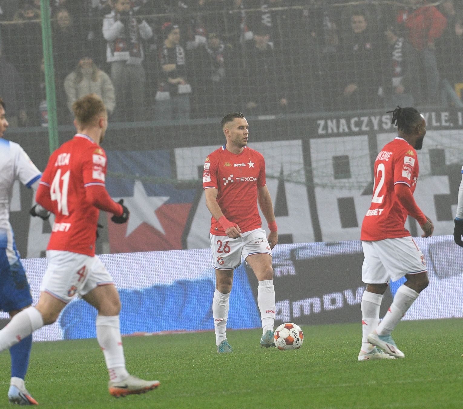 Defensywa gości pękła w 28. minucie. Po serii dynamicznych ataków Wisły, wynik na 1:0 otworzył Kacper Duda. Pomocnik wykorzystał precyzyjne podanie od Marko Bozicia, pokonując Matysa płaskim strzałem. Ten gol wyraźnie dodał wiatru w żagle krakowianom, którzy błyskawicznie podwyższyli prowadzenie.