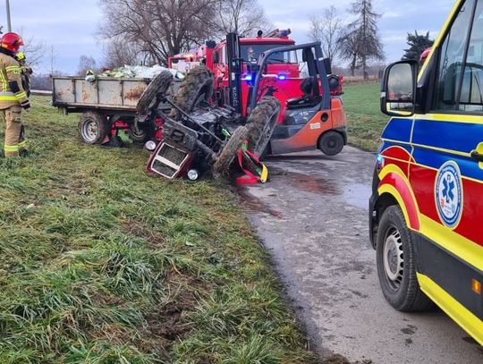 Do zdarzenia doszło dzisiaj w Dobrocieszy (powiat brzeski). Służby ratunkowe otrzymały wezwanie o godzinie 14:13. Po przybyciu na miejsce ratownicy zastali przewrócony ciągnik rolniczy, który leżał kołami do góry.