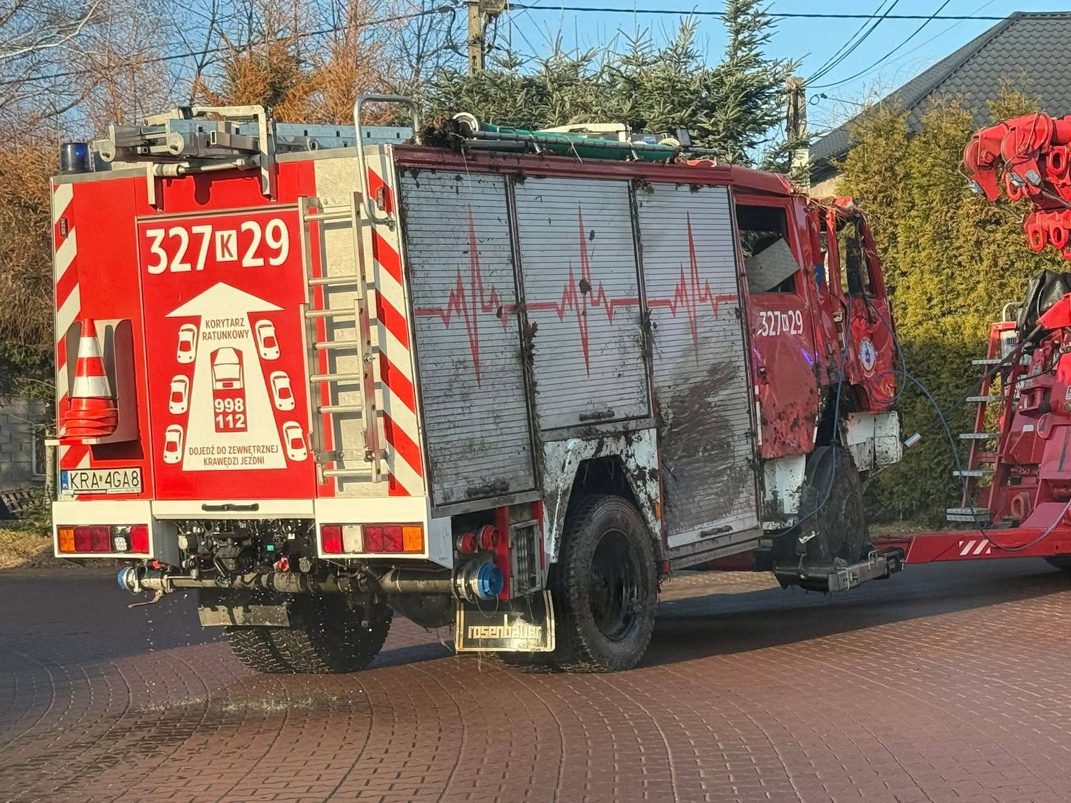 W chwili wypadku wewnątrz wozu strażackiego znajdowało się czterech ratowników. Trzech z nich opuściło pojazd bez poważniejszych obrażeń, jednak czwarty strażak doznał urazów wymagających specjalistycznej opieki medycznej. Na miejsce natychmiast skierowano dodatkowe siły i środki, w tym zastępy z Jednostki Ratowniczo-Gaśniczej w Skawinie oraz JRG 2 Kraków. Poszkodowany druh został sprawnie zabezpieczony przez zespoły ratownictwa medycznego i przetransportowany do szpitala w celu dalszej diagnostyki oraz leczenia.