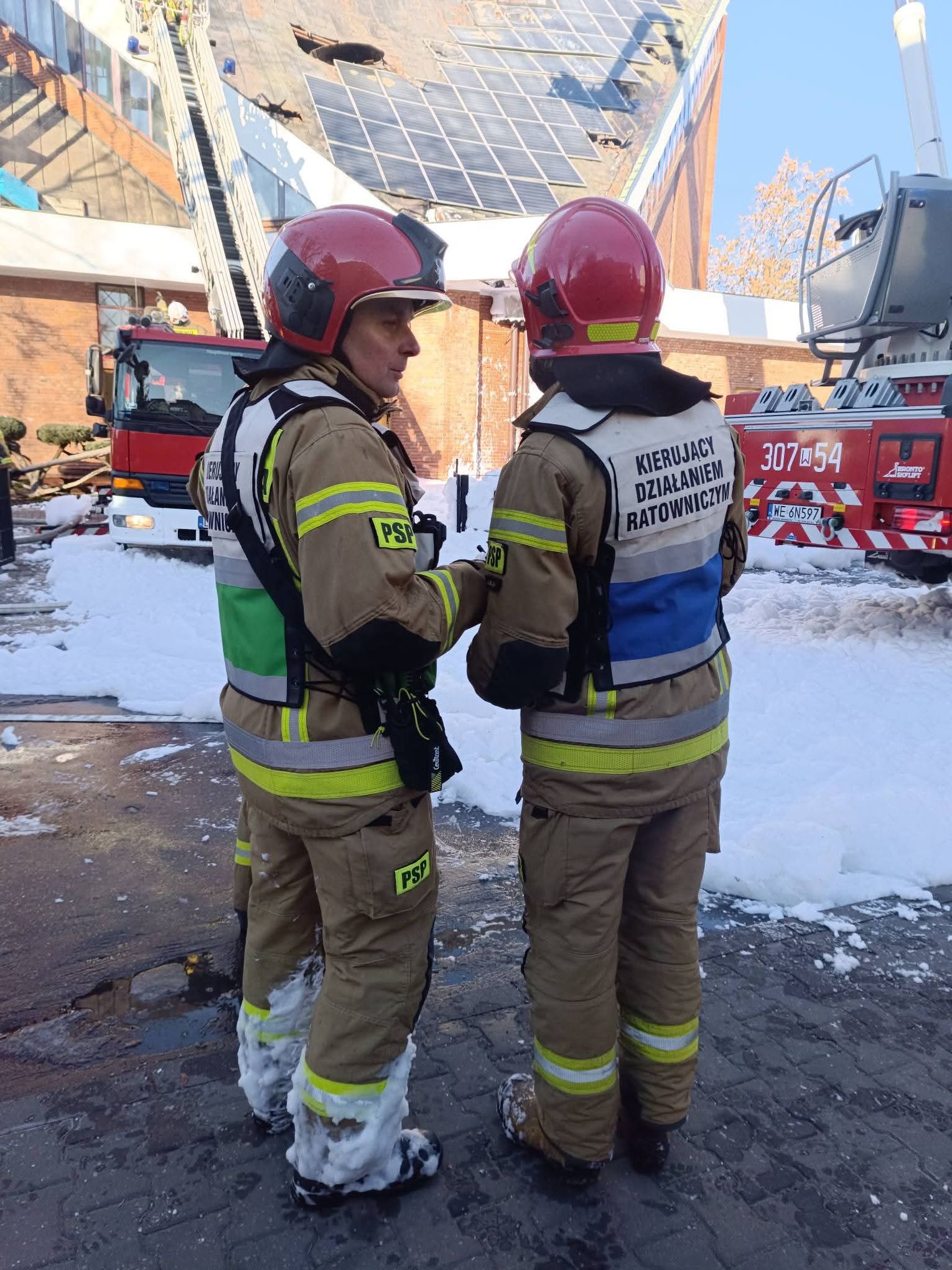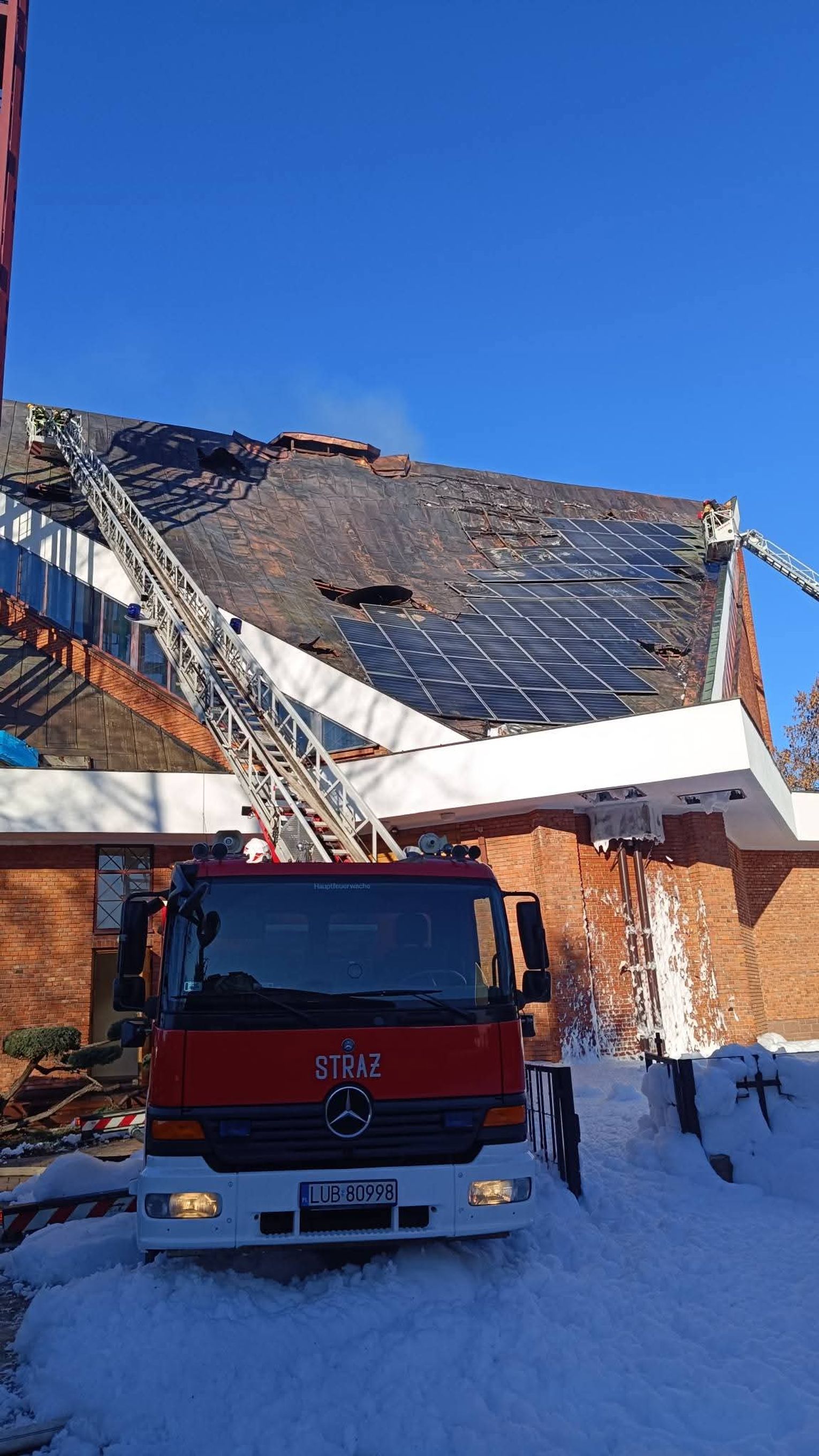 Na miejscu zdarzenia pracowało łącznie 80 strażaków z 27 zastępów Państwowej i Ochotniczej Straży Pożarnej. Akcja gaśnicza prowadzona była w skrajnie trudnych warunkach atmosferycznych – przy temperaturze sięgającej -10 stopni Celsjusza woda używana do gaszenia natychmiast zamarzała, utrudniając poruszanie się ratowników i obsługę sprzętu. Lubelski komendant wojewódzki PSP, st. bryg. Zenon Pisiewicz, wyjaśnił, że największym wyzwaniem była „wielowarstwowa” konstrukcja dachu. Warstwy blachy, drewna, stali oraz wełny mineralnej tworzyły barierę, którą strażacy musieli przebijać z zewnątrz, aby dotrzeć do ukrytych zarzewi ognia.