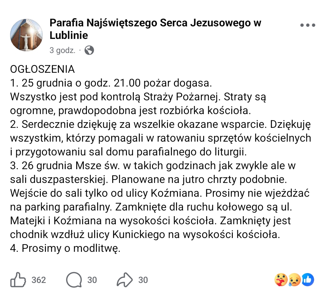 ![Pożar strawił dach kościoła Najświętszego Serca Jezusowego w Lublinie. Konieczna rozbiórka? [FOTO] Lublin, pożar kościoła w Lublinie, potężny pożar w Lublinie, dach kościoła spłonął doszczętnie, kościół nadaje się do rozbiórki, województwo lubelskie, akcja gaśnicza, zastępy straży pożarnej](https://static2.mjakmalopolska.pl/data/articles/xl-pozar-strawil-dach-kosciola-najswietszego-serca-jezusowego-w-lublinie-konieczna-rozbiorka-foto-1766707554.png)