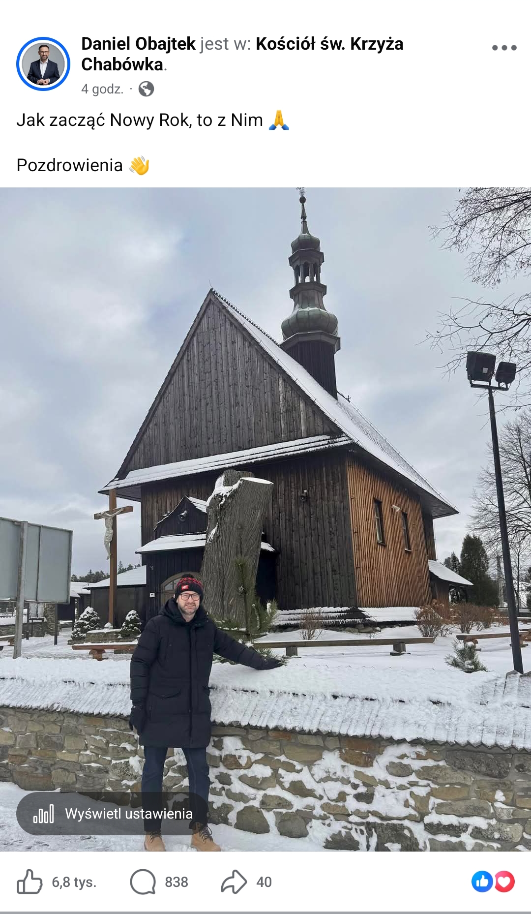Daniel Obajtek, były Prezes Zarządu ORLEN oraz poseł do Parlamentu Europejskiego cel miał zgoła inny. Odwiedził bardzo popularny Kościół Świętego Krzyża na Obidowej w Chabówce, który znajduje się tuż przy popularnej drodze z Krakowa do Zakopanego. Fotografia opatrzona opisem "Jak zacząć Nowy Rok, to z Nim 🙏Pozdrowienia 👋" jest mocno komentowana przez internautów, mając ponad 800 komentarzy i prawie 8 tysięcy polubień.