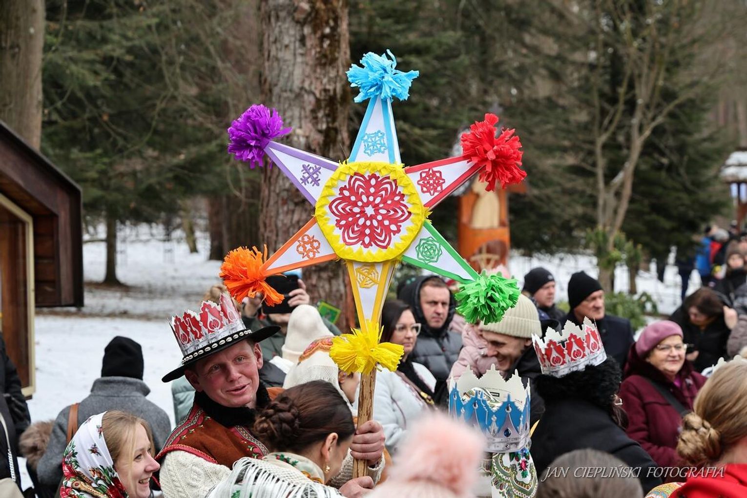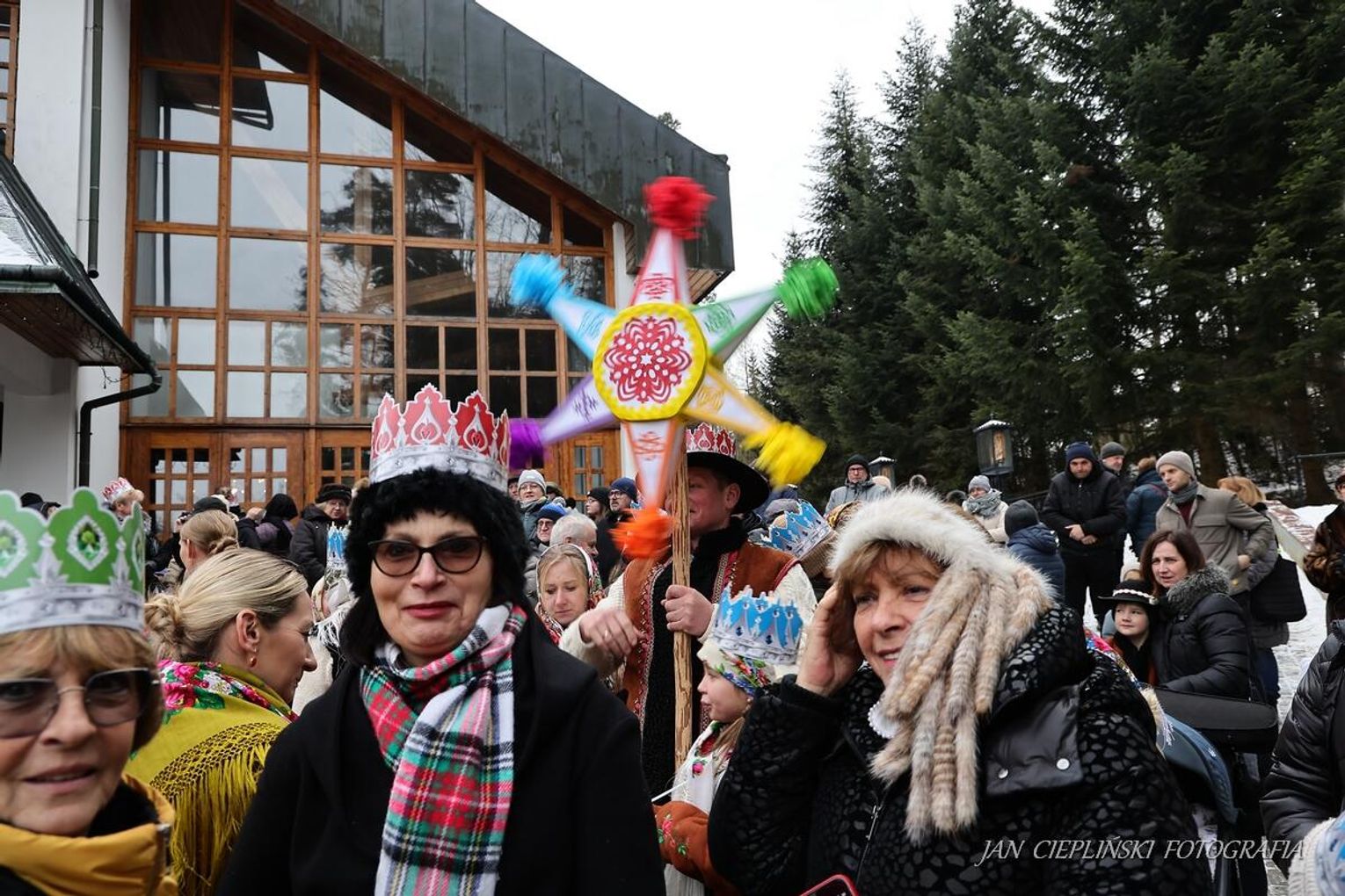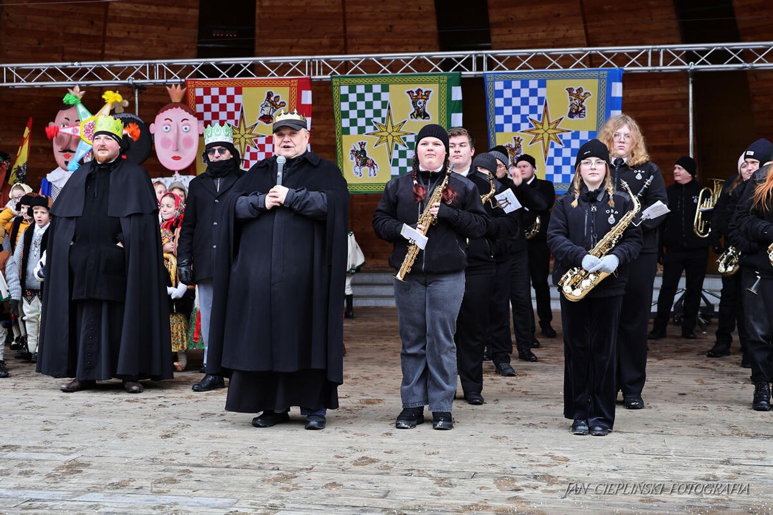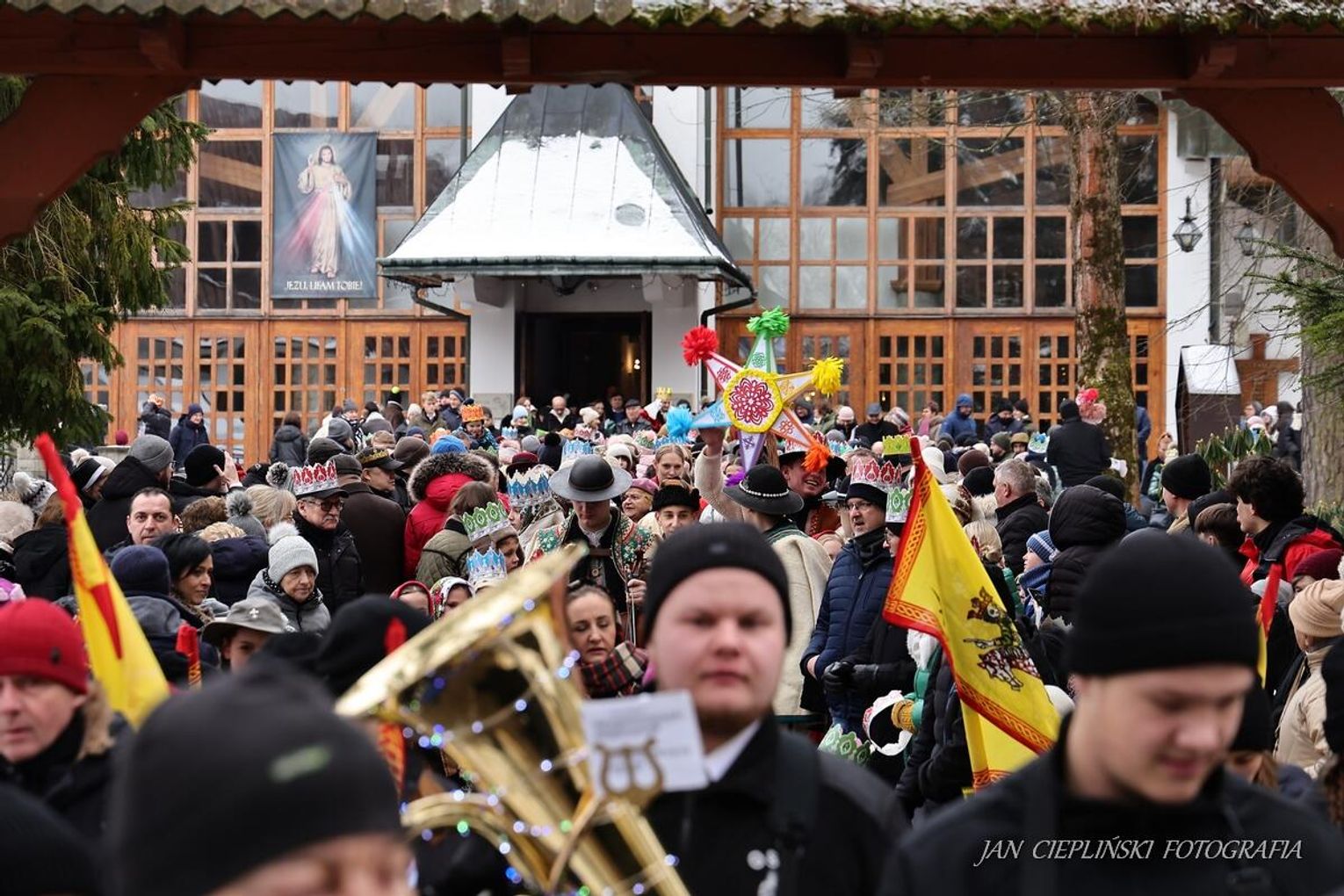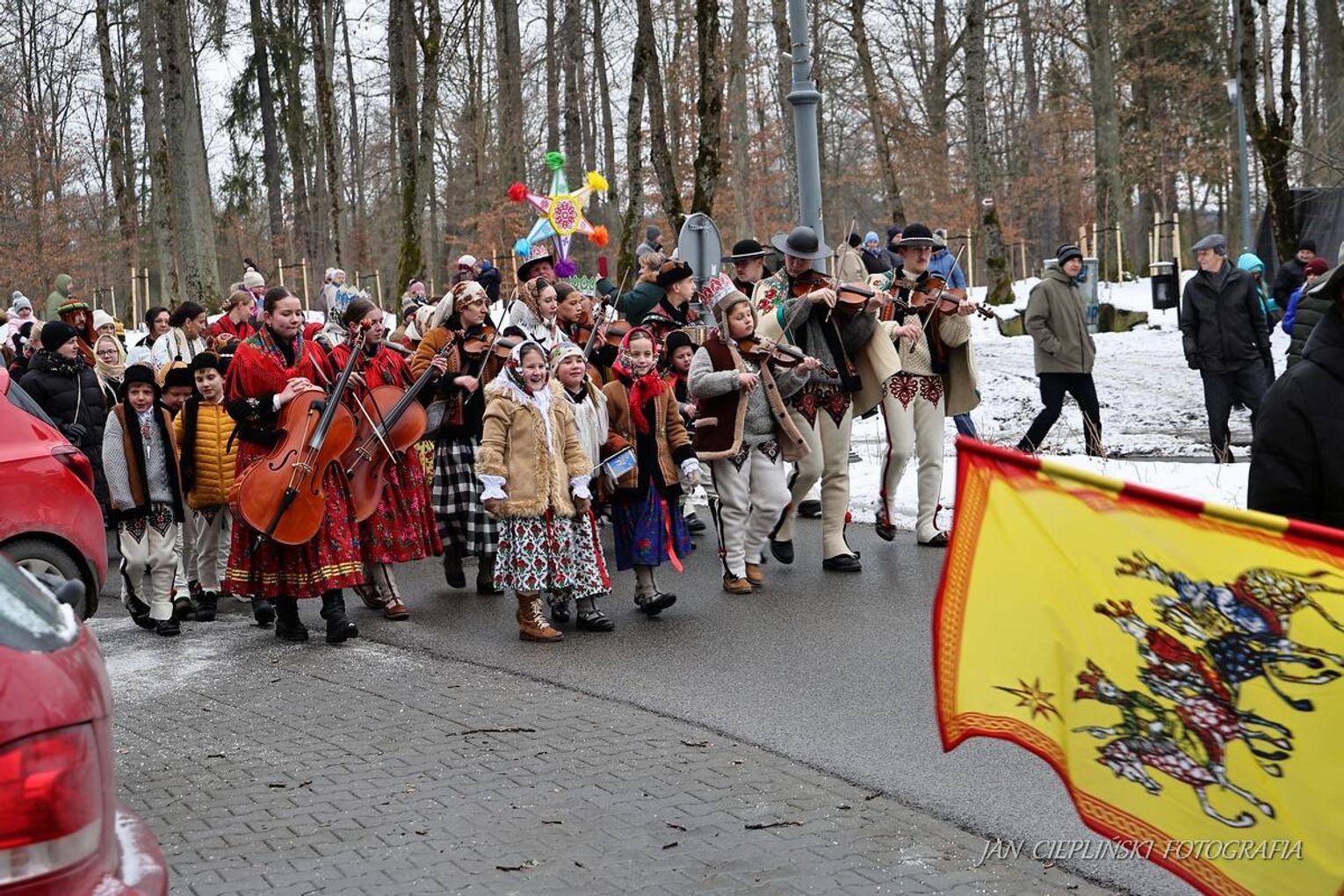 Po zakończeniu liturgii uformował się imponujący orszak, na czele którego stanęli symboliczni Trzej Królowie. W procesji ramię w ramię z duchowieństwem szli przedstawiciele władz samorządowych z Burmistrzem Rabki-Zdroju Leszkiem Świdrem na czele. Uczestnicy pochodu, zgodnie z tradycją, przyozdobili głowy tekturowymi koronami, a w dłoniach nieśli okolicznościowe chorągwie orszakowe.