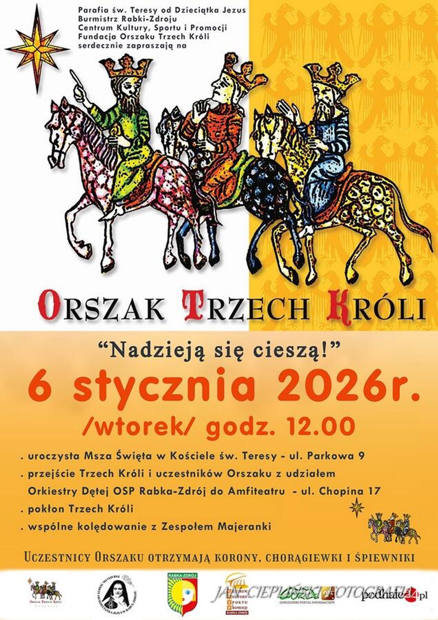 Sukces tegorocznego Orszaku Trzech Króli był możliwy dzięki szerokiej współpracy wielu instytucji. Za organizację odpowiadały wspólnie Parafia św. Teresy od Dzieciątka Jezus, Urząd Miejski w Rabce-Zdroju, Centrum Kultury, Sportu i Promocji oraz ogólnopolska Fundacja Orszak Trzech Króli. Wybrane na ten rok hasło „Nadzieją się cieszą!” wybrzmiało w Rabce-Zdroju ze szczególną mocą, przypominając, że tradycja orszakowa to nie tylko widowiskowe przejście ulicami, ale przede wszystkim niesienie optymizmu i budowanie poczucia jedności w trudnych czasach.