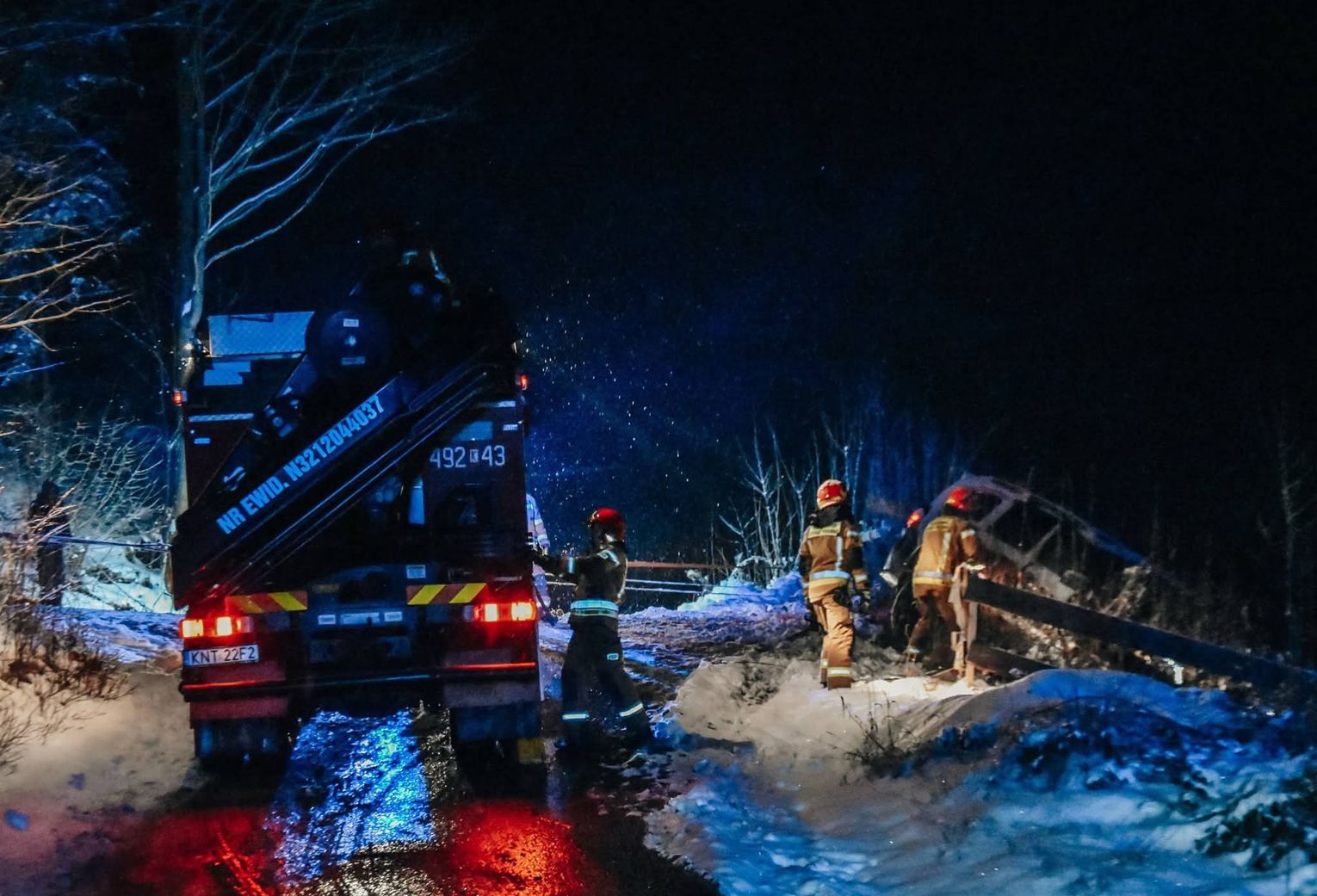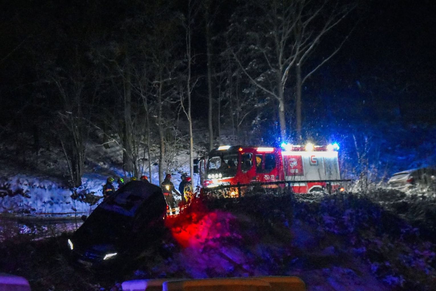 Na miejsce zadysponowano zastępy straży pożarnej z JRG Rabka-Zdrój, JRG Limanowa (posterunek Mszana Dolna) oraz druhów z OSP Mszana Dolna, którzy za pomocą specjalistycznego sprzętu i wyciągarki wydostali pojazd na płaski teren. Nie zabrakło również funkcjonariuszy Policji, którzy ustalali okoliczności i przyczyny zdarzenia.