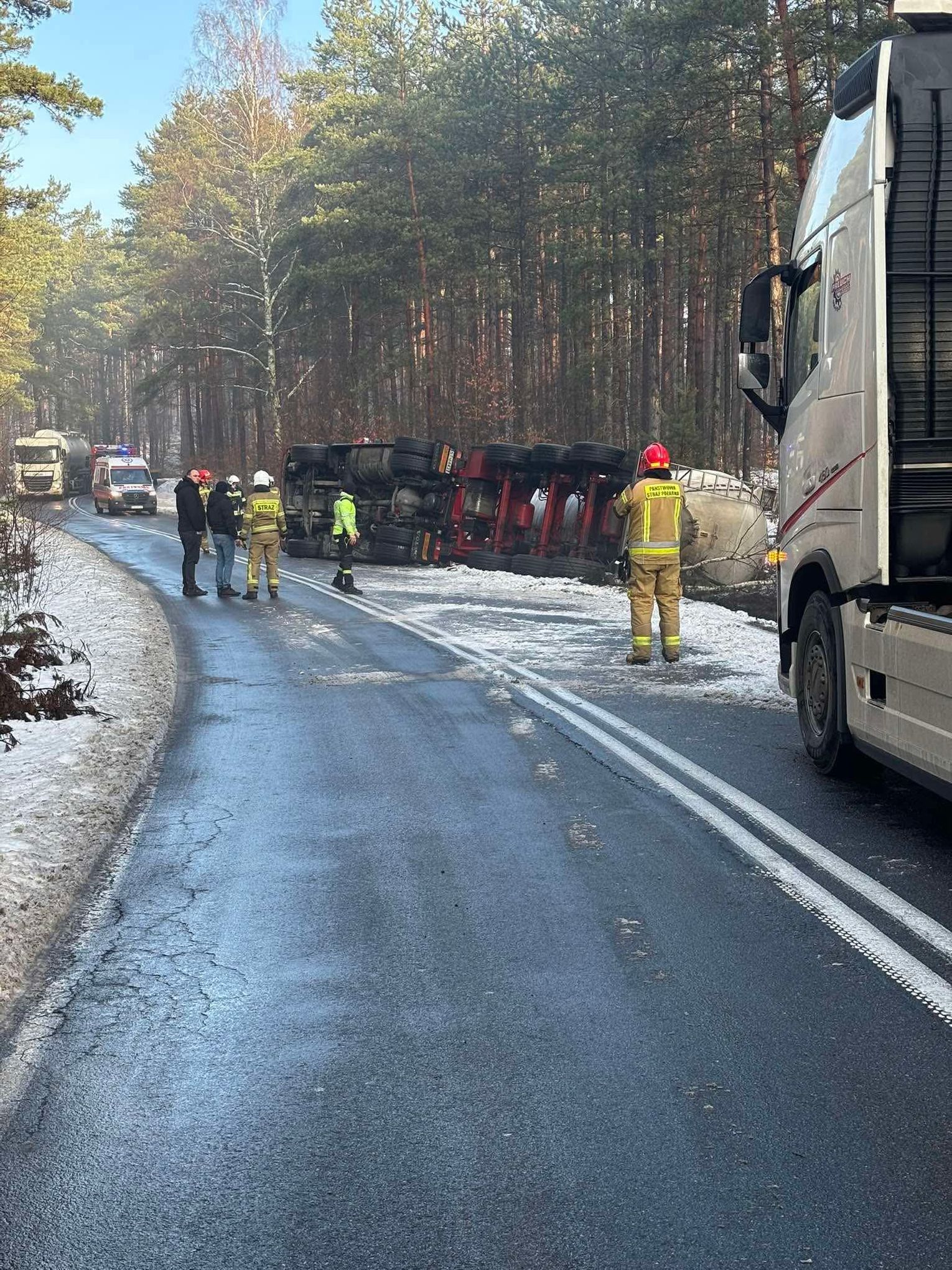 Władze oraz służby apelują do kierowców o zachowanie szczególnej ostrożności na drogach prowadzących przez tereny leśne, gdzie panujące w połowie stycznia warunki atmosferyczne mogą znacząco ograniczać przyczepność nawierzchni. Na miejscu trwała procedura weryfikacji stanu technicznego pojazdu oraz sprawdzanie, czy nie doszło do rozszczelnienia zbiornika naczepy, co mogłoby skutkować skażeniem pobliskiego ekosystemu leśnego. Szczegółowe przyczyny utraty stabilności przez ciężarówkę będą przedmiotem prowadzonego przez policję dochodzenia.