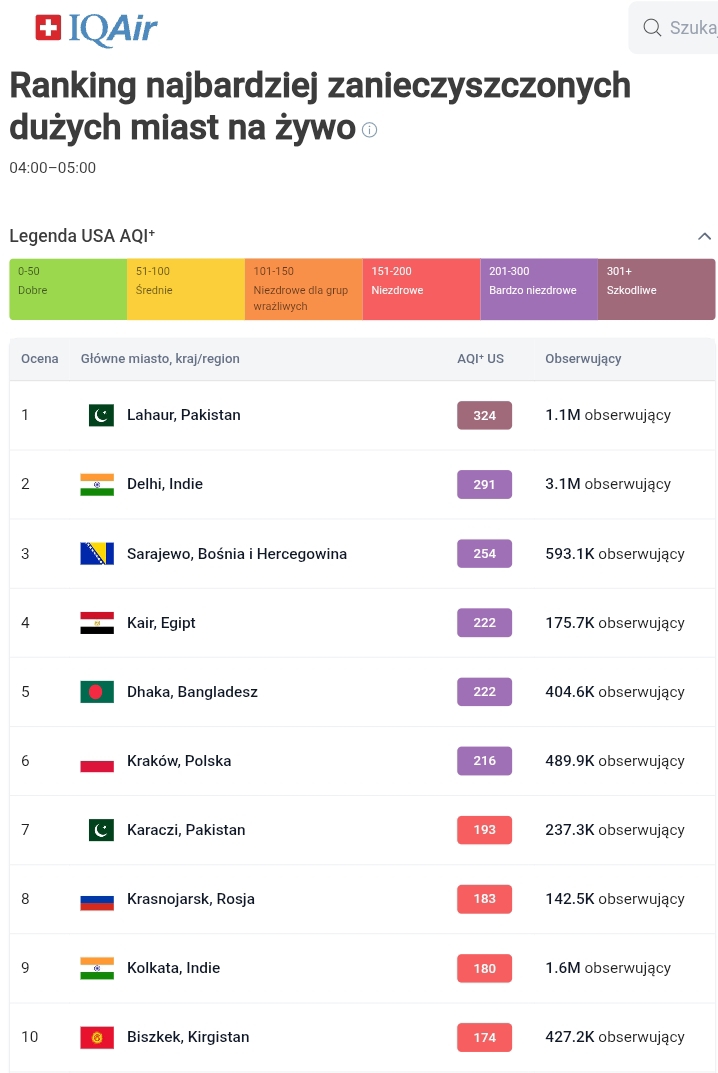 W czwartek nad ranem 22 stycznia (godzina 4:00) miasto plasowało się na szóstej pozycji, pozostając w towarzystwie reprezentantów Pakistanu, Bangladeszu oraz Egiptu. Mimo wymiany tysięcy kotłów węglowych w samym mieście i wprowadzenia od początku 2026 roku Strefy Czystego Transportu, problem smogu powrócił z pełną siłą ze względu na napływ zanieczyszczeń z gmin ościennych oraz intensywne dogrzewanie domów paliwami stałymi podczas mroźnej aury.