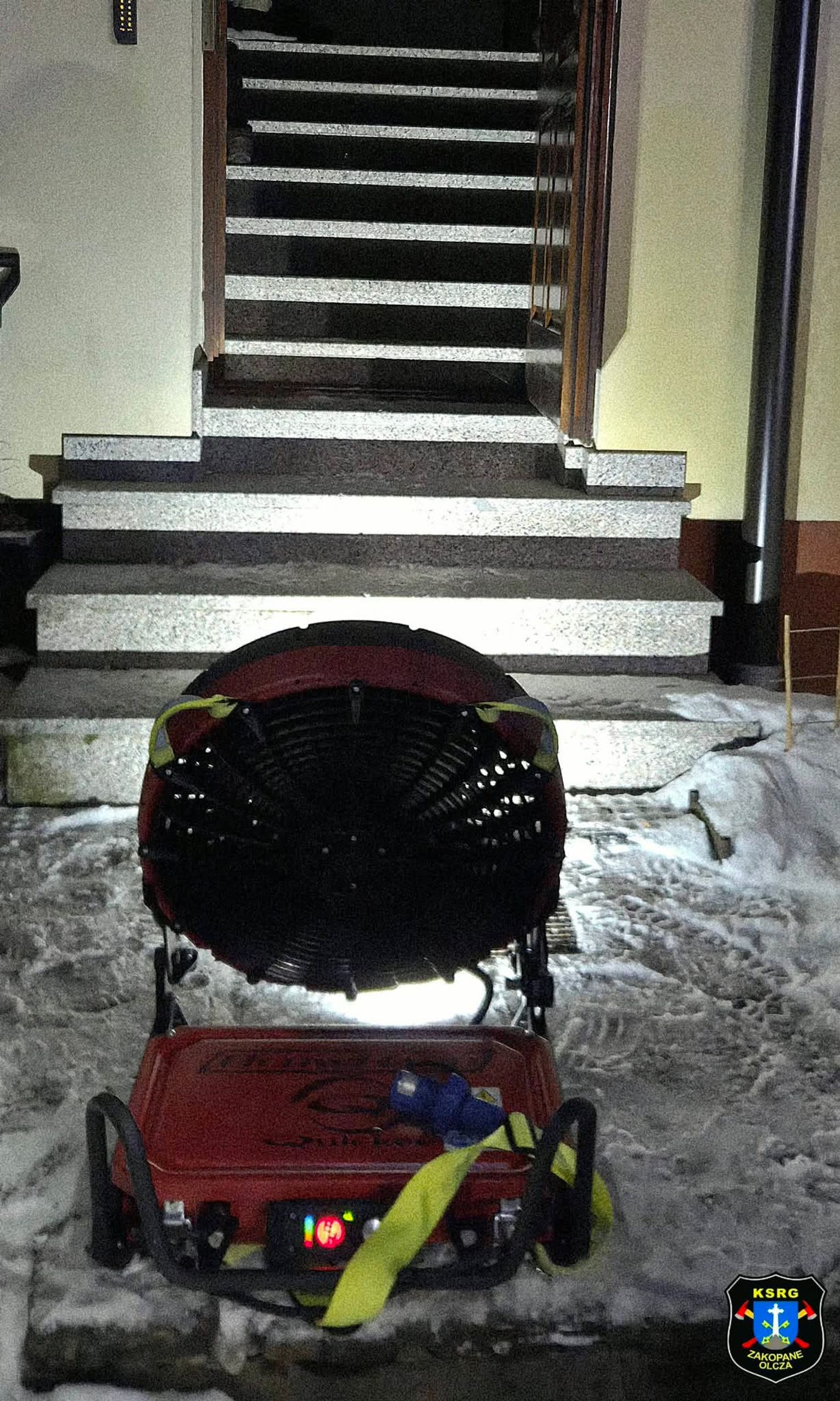 Po opanowaniu głównego źródła ognia, ratownicy z Olczy skoncentrowali swoje wysiłki na usunięciu toksycznych produktów spalania, które wypełniły klatkę schodową oraz wyższe piętra budynku. Do tego celu wykorzystano nowoczesny, akumulatorowy wentylator oddymiający, który pozwolił na szybką wymianę powietrza w obiekcie bez konieczności rozciągania uciążliwych przewodów zasilających. Takie działanie było niezbędne, aby umożliwić mieszkańcom bezpieczny powrót do ich lokali oraz zminimalizować szkody powstałe w wyniku zadymienia ścian i wyposażenia wnętrz.