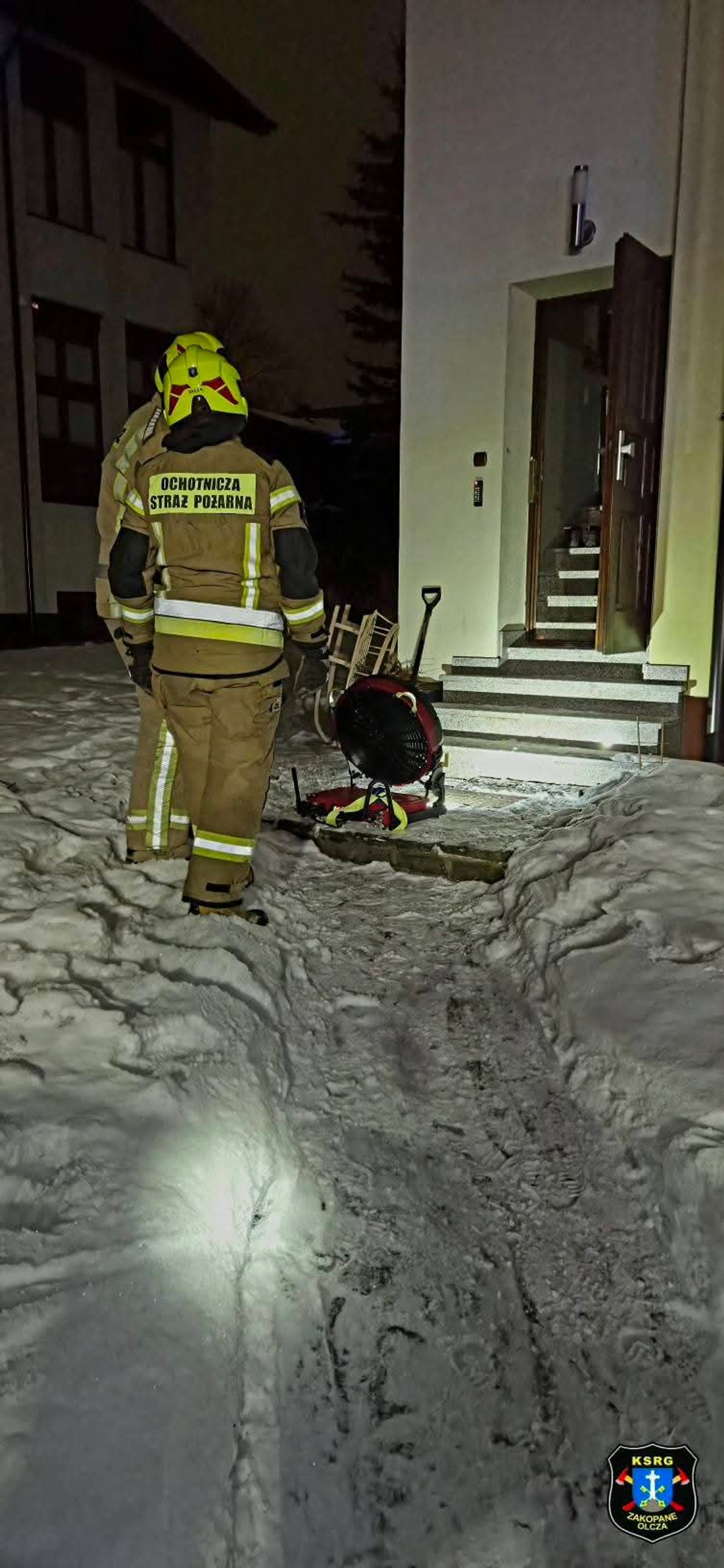 Równolegle z wentylacją, strażacy przeprowadzili szczegółowe pomiary atmosfery w budynku przy użyciu specjalistycznego miernika wielogazowego, aby wykluczyć obecność tlenku węgla oraz innych niebezpiecznych substancji chemicznych. Monitorowanie stężeń gazów pożarowych jest standardową, lecz niezwykle ważną procedurą, która gwarantuje, że budynek jest w pełni bezpieczny do dalszego użytkowania. Cały teren operacji gaśniczej był zabezpieczany przez patrol zakopiańskiej policji, który dbał o drożność dróg dojazdowych dla kolejnych wozów bojowych oraz odgradzał miejsce zdarzenia od osób postronnych.