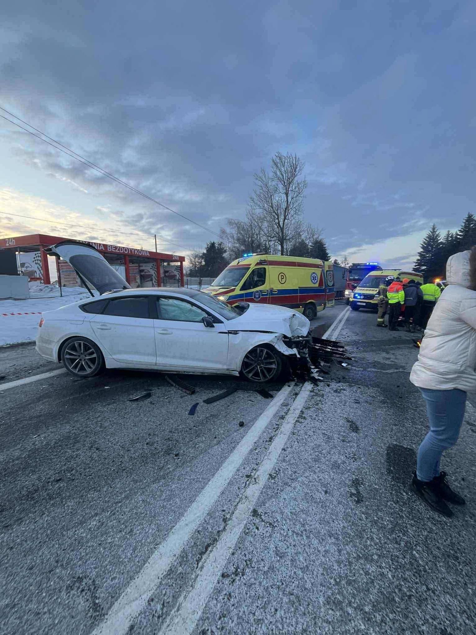 Na miejscu działają służby ratunkowe: zastępy straży pożarnej, Zespoły Ratownictwa Medycznego oraz funkcjonariusze Policji, którzy ustalają okoliczności i przyczyny zdarzenia. Obecnie droga krajowa łącząca Kraków z Olkuszem jest całkowicie zablokowana. Kierowcy proszeni są o skorzystanie z objazdów.