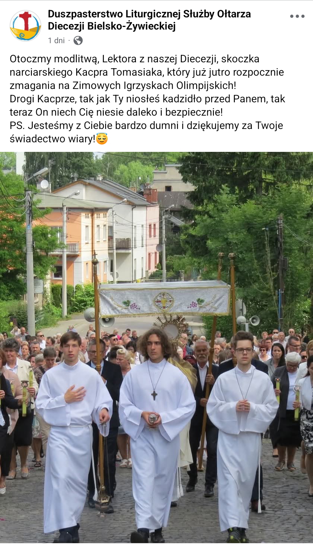 Przed decydującym konkursem olimpijskim duszpasterstwo opublikowało poruszający apel o wsparcie modlitewne dla Kacpra Tomasiaka, podkreślając dumę z jego postawy. W oficjalnym komunikacie nawiązano do jego posługi liturgicznej, życząc mu, aby Bóg „niósł go daleko i bezpiecznie” na skoczni, tak jak on niósł kadzidło podczas uroczystości kościelnych. Po ogłoszeniu wyników i potwierdzeniu zdobycia srebrnego krążka, w sieci pojawił się entuzjastyczny wpis gratulacyjny, w którym ogłoszono wielki sukces sportowca słowami: „Kacper jesteś Wielki! A Pan poniósł Cię daleko!”.