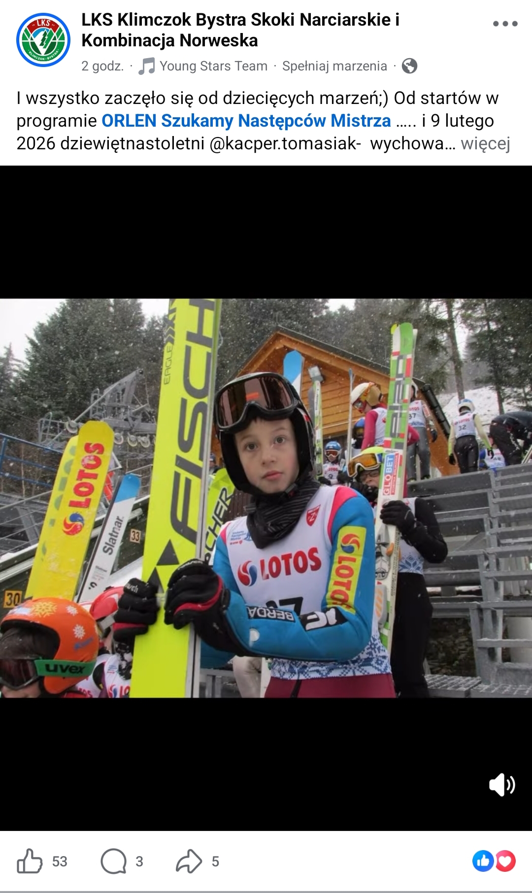 - I wszystko zaczęło się od dziecięcych marzeń. Od startów w programie ORLEN Szukamy Następców Mistrza ….. i 9 lutego 2026 dziewiętnastoletni Kacper Tomasiak - wychowanek naszego klubu zostaje VICE MISTRZEM OLIMPIJSKIM 🥈👏Brakuje słów, żeby oddać to wzruszenie i radość, którą czujemy MY cała skokowa rodzina LKS Klimczok Bystra. KACPER GRATULUJEMY i DZIĘKUJEMY 😍 - czytamy na łamach mediów społecznościowych klubu.