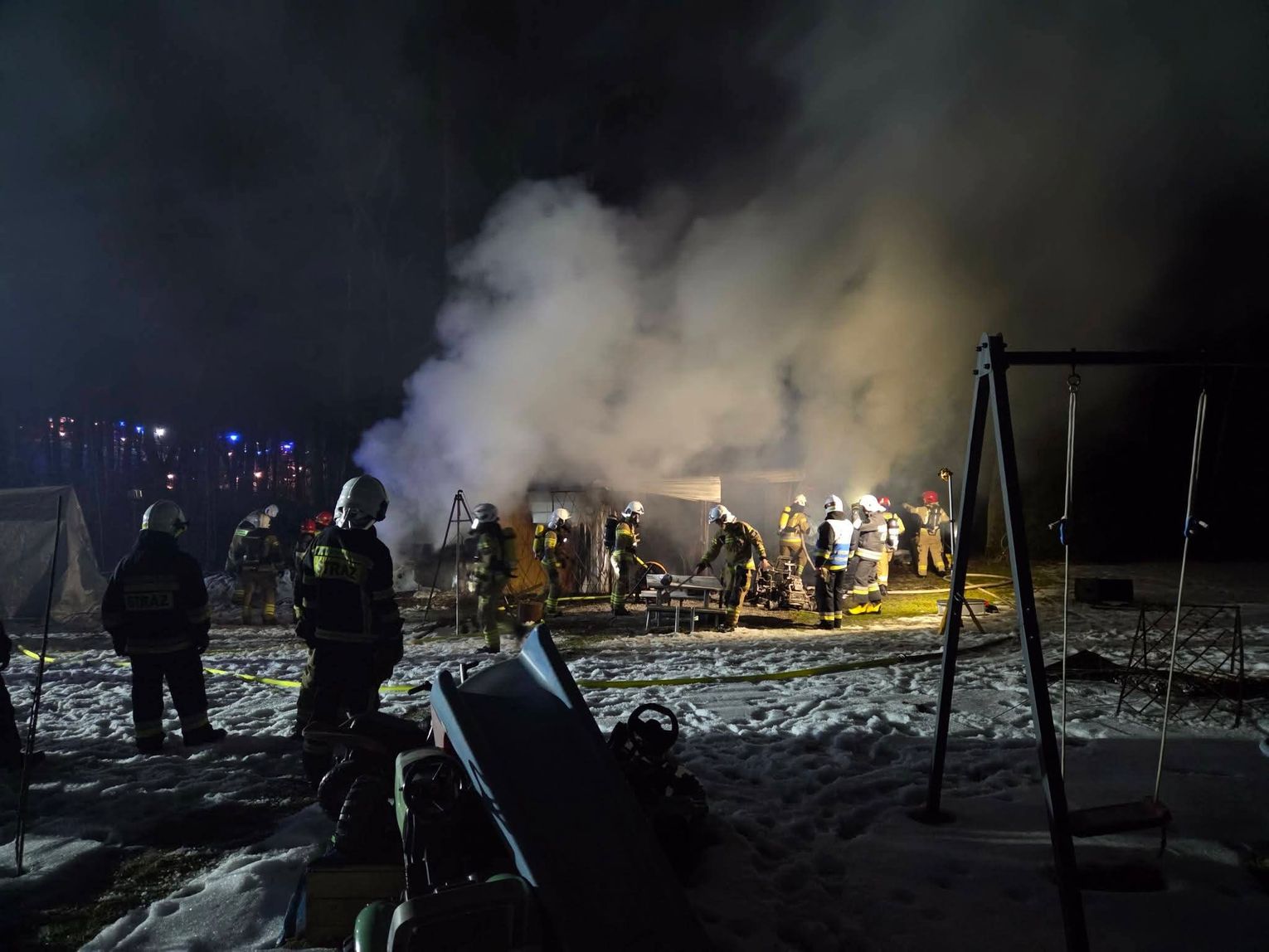 Podczas operacji strażacy pracowali w trudnych warunkach nocnych, sukcesywnie dogaszając zarzewia ognia i dokonując niezbędnych prac rozbiórkowych nadpalonej konstrukcji. Bardzo ważną informacją płynącą z miejsca zdarzenia jest fakt, że w wyniku pożaru nikt nie odniósł obrażeń, a służby medyczne nie musiały udzielać pomocy żadnej osobie poszkodowanej. Na terenie posesji pracowali funkcjonariusze oraz eksperci z zakresu pożarnictwa, którzy zajmowali się wyjaśnianiem szczegółowych przyczyn powstania ognia oraz weryfikowali, czy do zdarzenia nie przyczyniły się osoby trzecie lub usterka techniczna.