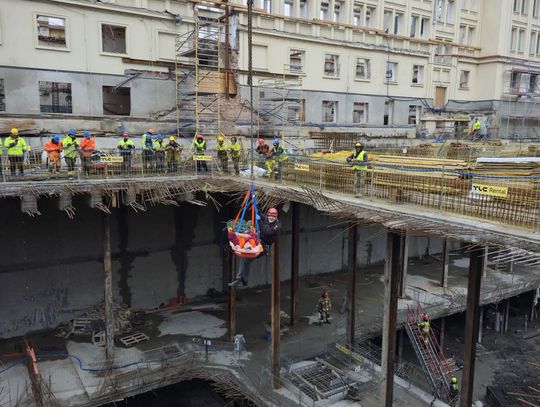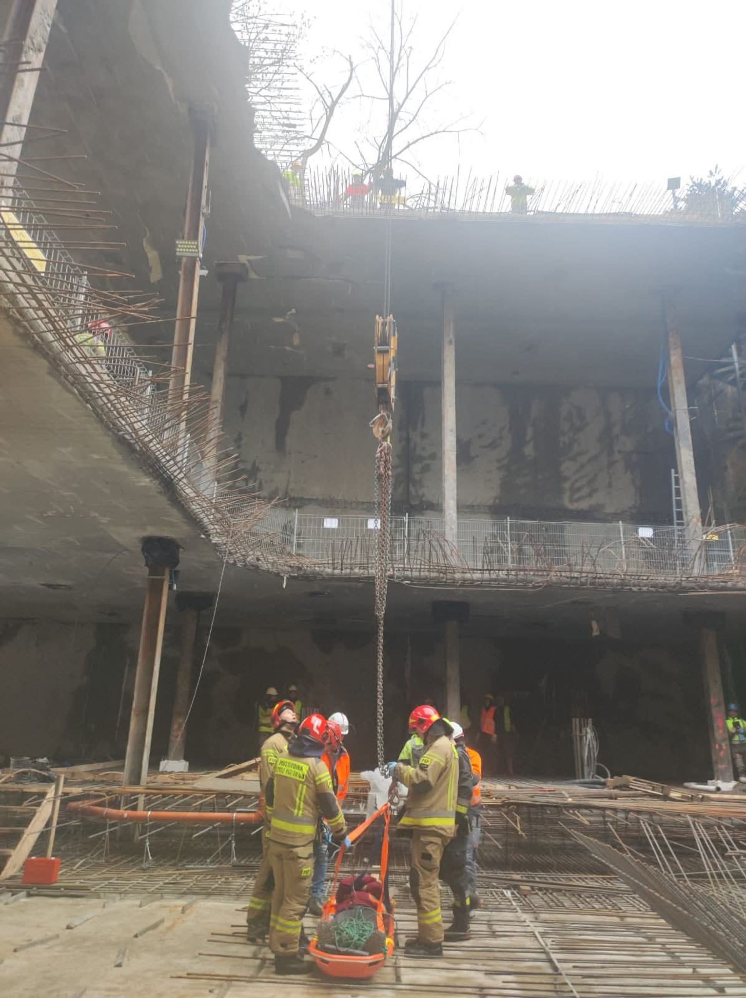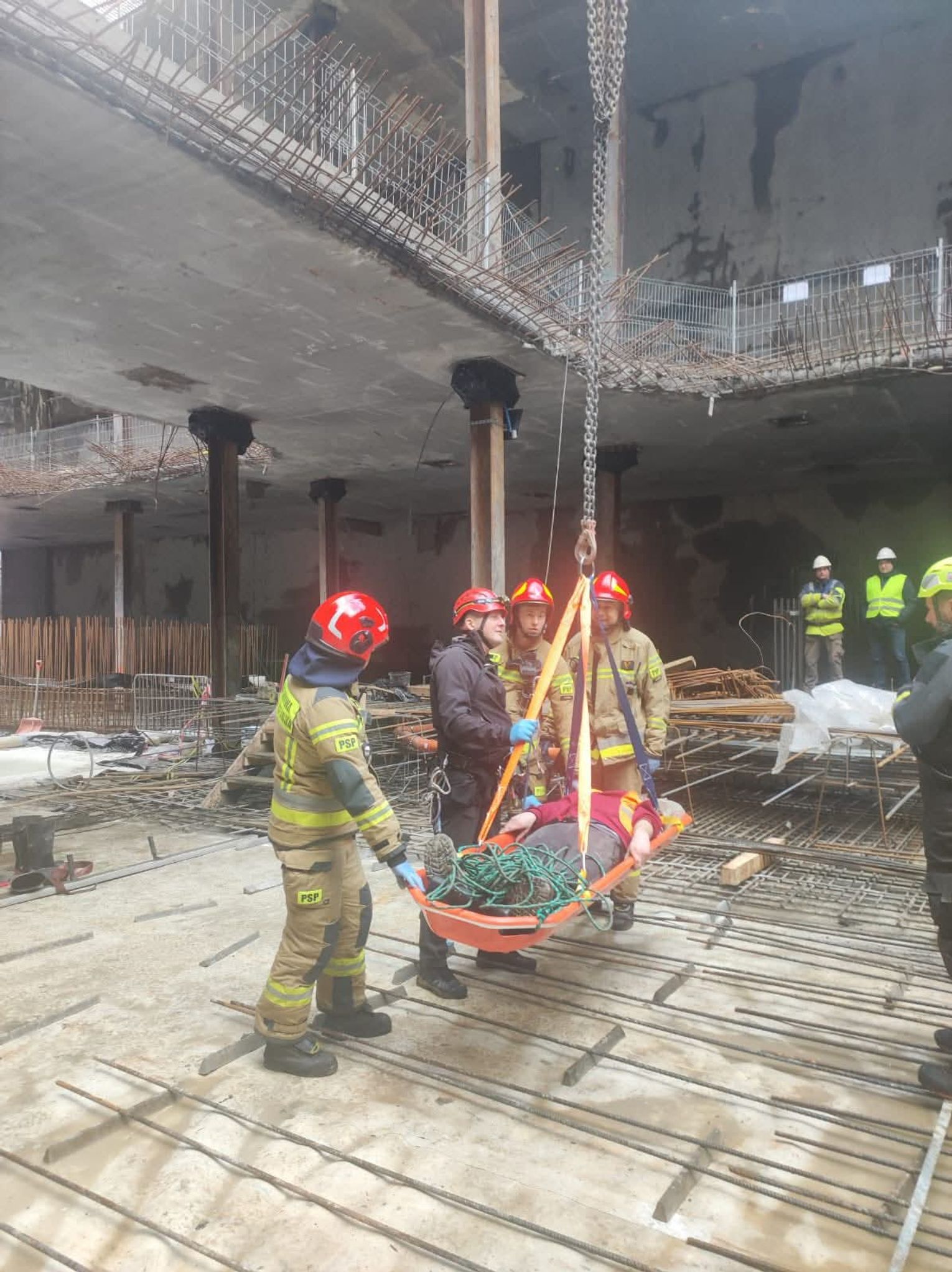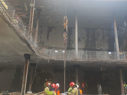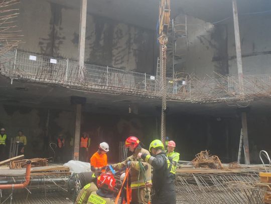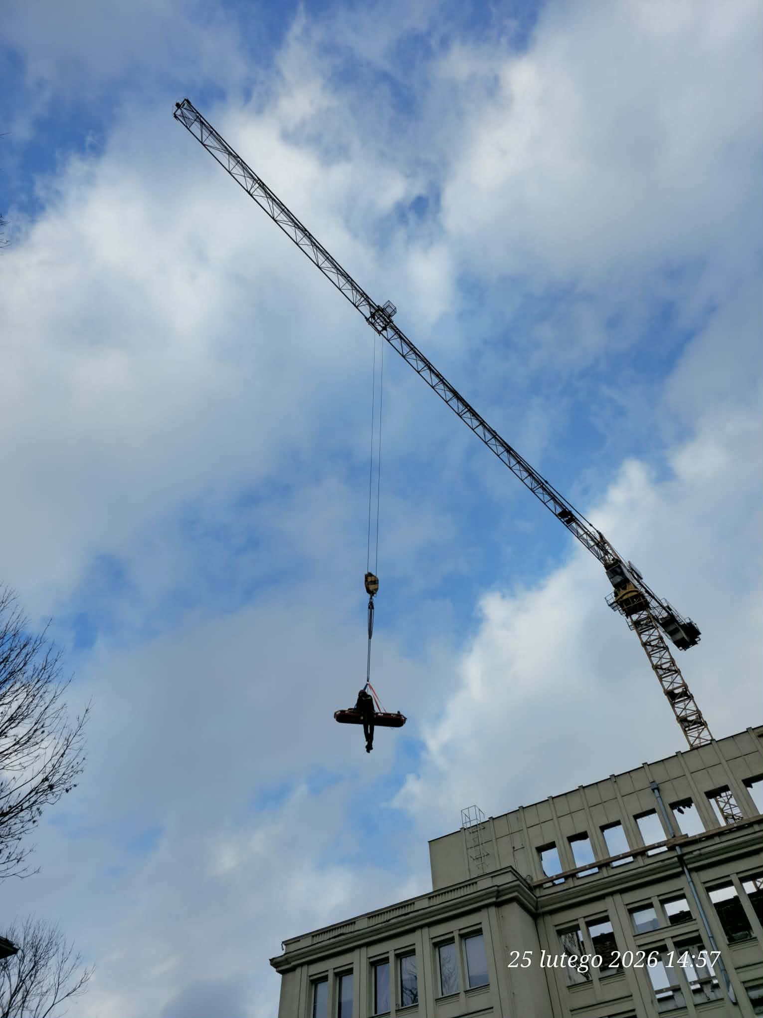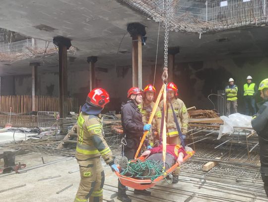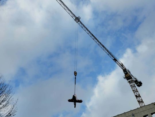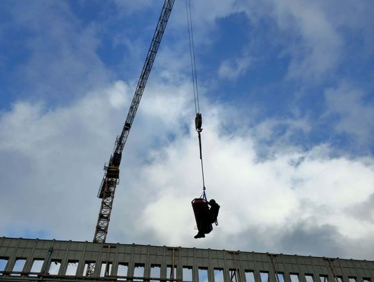 Kolejnym etapem było wykorzystanie ciężkiego sprzętu budowlanego w niestandardowy sposób, co wymagało idealnej koordynacji pomiędzy operatorem dźwigu a dowódcą straży. Do podniesienia noszy z głębokości 18 metrów wykorzystano żuraw wieżowy znajdujący się na terenie budowy, który po odpowiednim olinowaniu stał się głównym narzędziem ewakuacji. Przez cały czas trwania transportu na wysokości, bezpośrednio przy noszach, znajdował się ratownik z SGRW, który czuwał nad bezpiecznym przejściem poszkodowanego przez kolejne poziomy konstrukcji budowy. Taka technika, choć ryzykowna, była najszybszym i najbezpieczniejszym sposobem na wydostanie 30-latka z pułapki, jaką w tej sytuacji stał się fundament budynku.