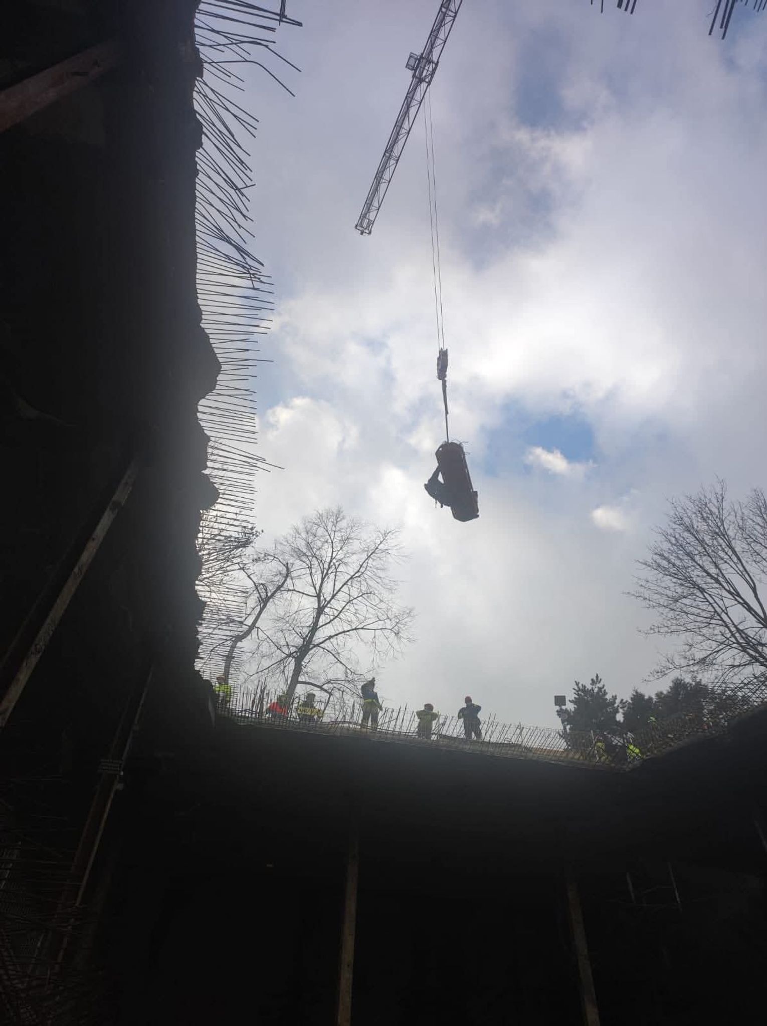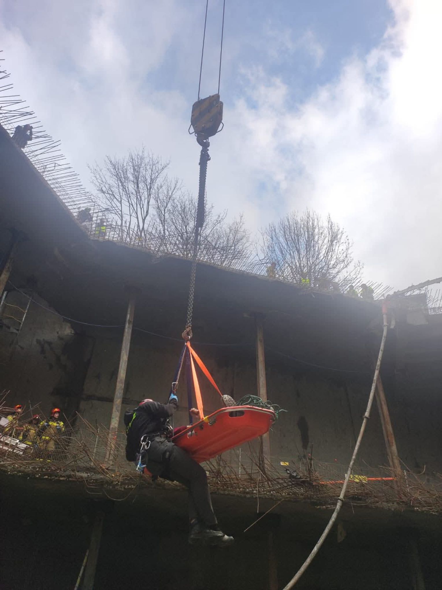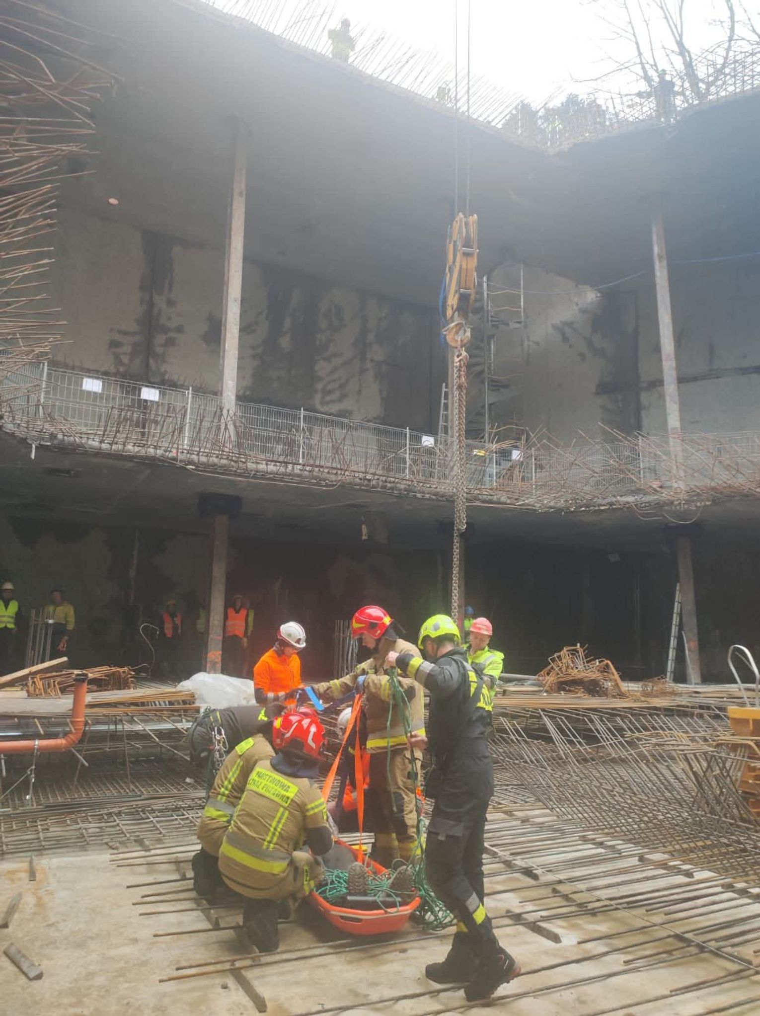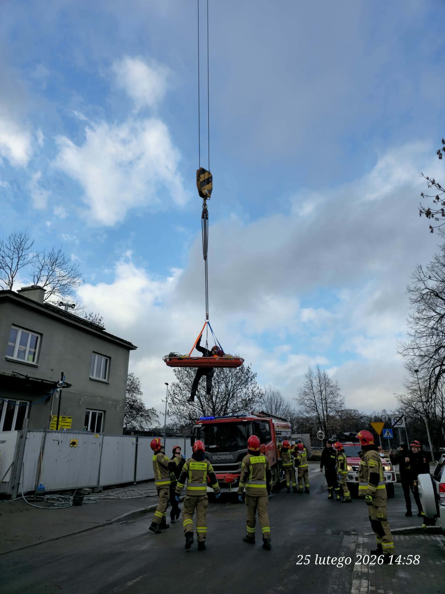 Kolejnym etapem było wykorzystanie ciężkiego sprzętu budowlanego w niestandardowy sposób, co wymagało idealnej koordynacji pomiędzy operatorem dźwigu a dowódcą straży. Do podniesienia noszy z głębokości 18 metrów wykorzystano żuraw wieżowy znajdujący się na terenie budowy, który po odpowiednim olinowaniu stał się głównym narzędziem ewakuacji. Przez cały czas trwania transportu na wysokości, bezpośrednio przy noszach, znajdował się ratownik z SGRW, który czuwał nad bezpiecznym przejściem poszkodowanego przez kolejne poziomy konstrukcji budowy. Taka technika, choć ryzykowna, była najszybszym i najbezpieczniejszym sposobem na wydostanie 30-latka z pułapki, jaką w tej sytuacji stał się fundament budynku.