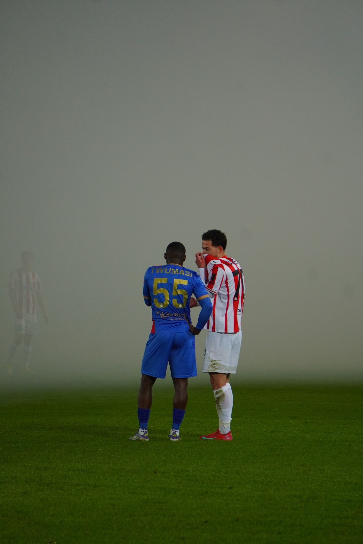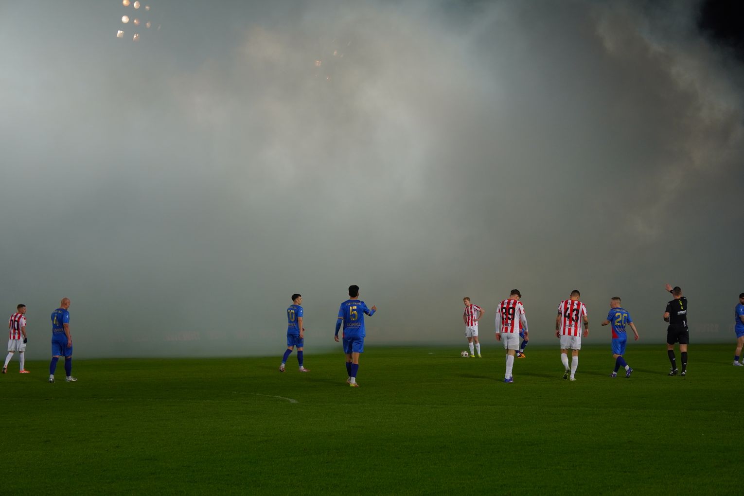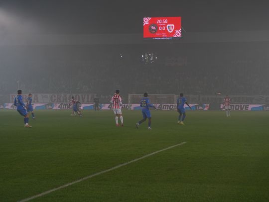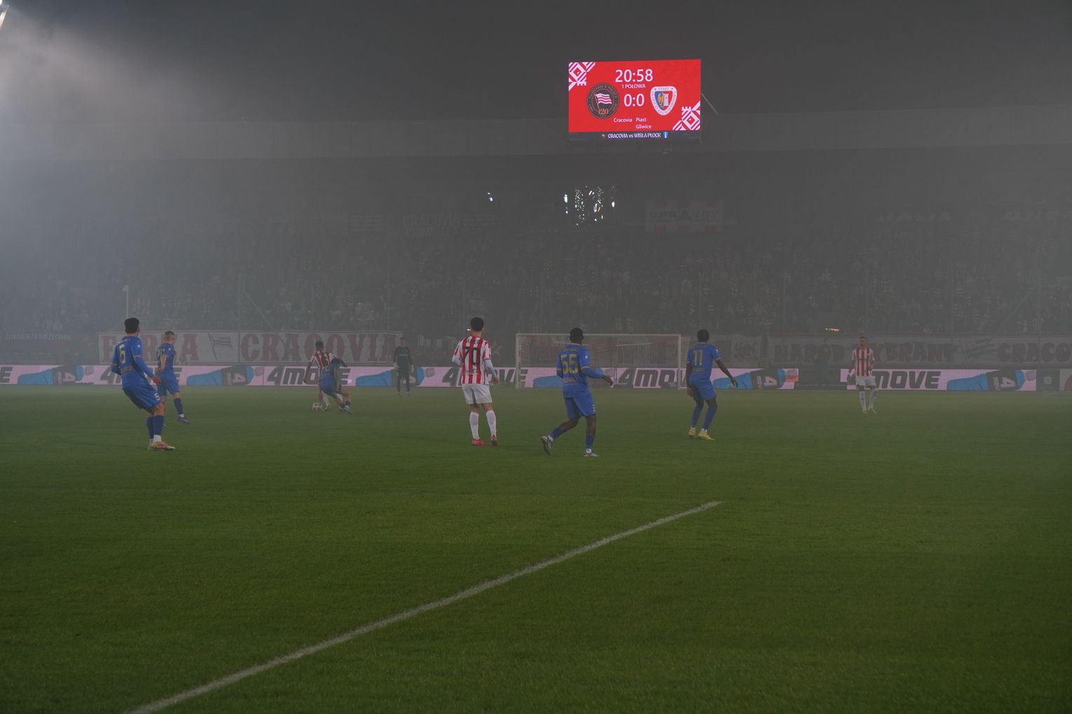 Początkowa faza meczu w Krakowie nie należała do najbardziej porywających widowisk, gdyż oba zespoły skoncentrowały się na defensywie i nie przejawiały większej ochoty do zdecydowanych ataków. Sytuacja zmieniła się około 10. minuty, kiedy sędzia został zmuszony do przerwania gry na blisko siedem minut z powodu gęstego zadymienia boiska wywołanego przez oprawę kibiców. Po wymuszonej pauzie tempo spotkania wzrosło, a zawodnicy obu drużyn zaczęli odważniej operować piłką w strefie podbramkowej, co zapowiadało zbliżające się emocje strzeleckie.