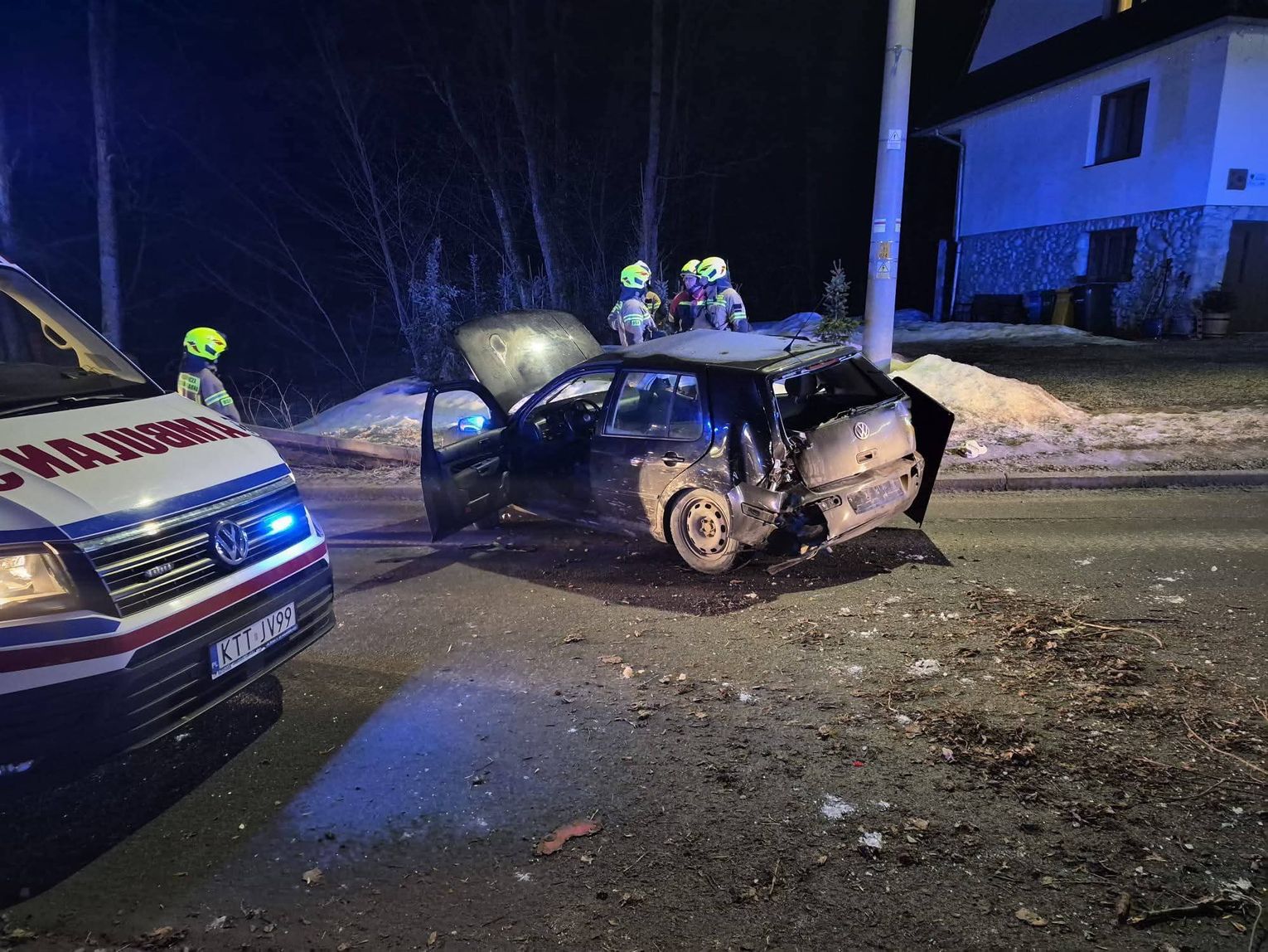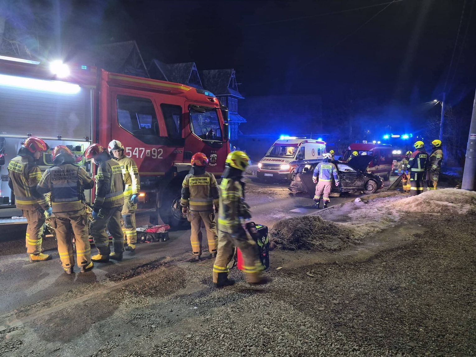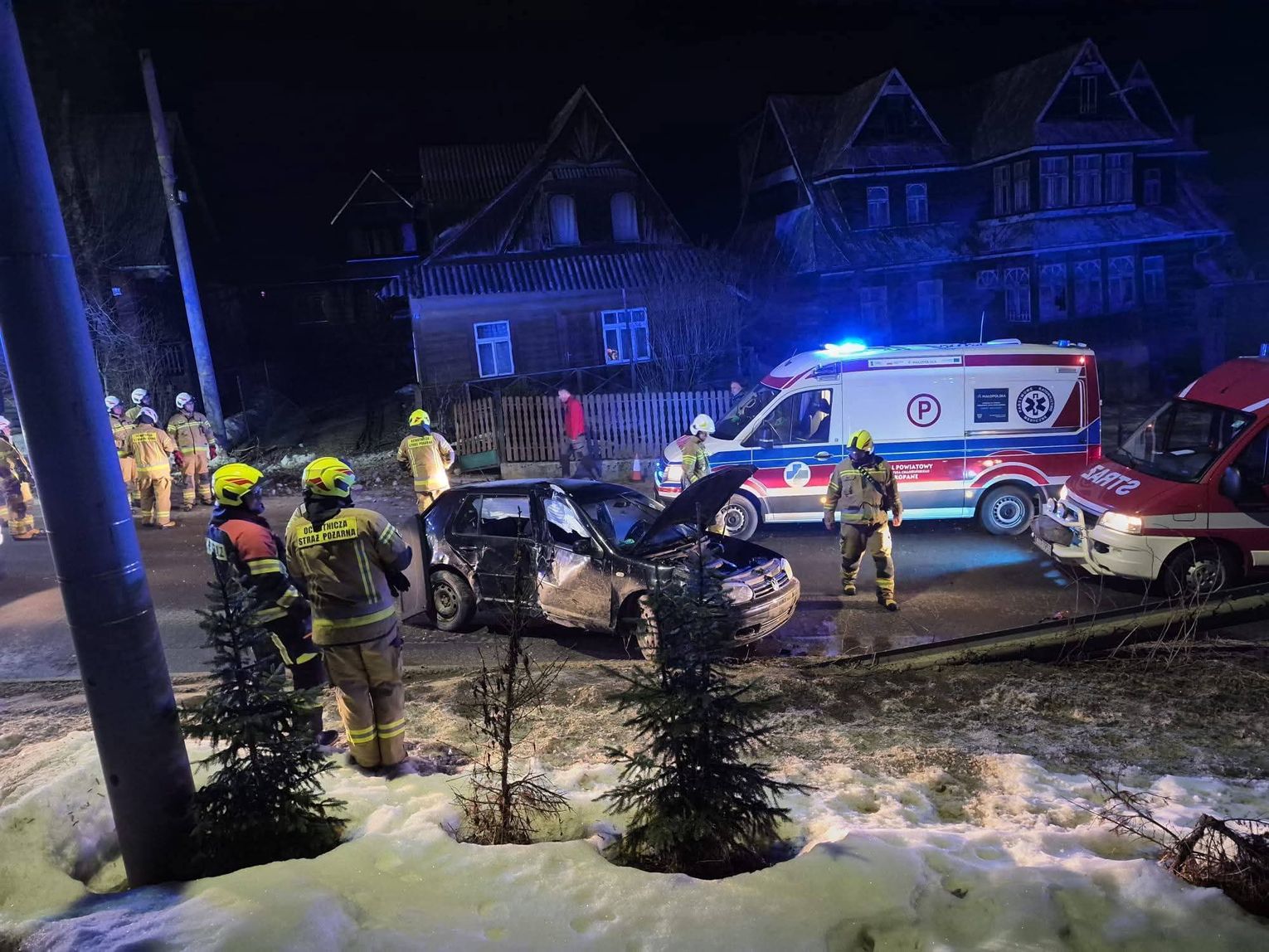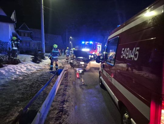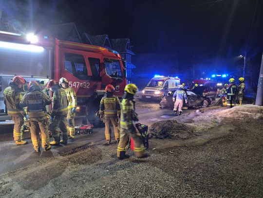 Zgłoszenie o wypadku wpłynęło do służb ratunkowych w godzinach nocnych, informując o samochodzie osobowym, który z dużą siłą uderzył w elementy infrastruktury posesji przy drodze prowadzącej przez miejscowość Suche. Na miejsce zdarzenia natychmiast zadysponowano zastępy z Ochotniczej Straży Pożarnej w Suchej oraz Poroninie, a także jednostki z Komendy Powiatowej Państwowej Straży Pożarnej w Zakopanem. Strażacy zabezpieczyli uszkodzony pojazd, zneutralizowali wycieki płynów eksploatacyjnych oraz oświetlili teren działań, aby umożliwić bezpieczną pracę ratownikom medycznym i funkcjonariuszom policji.