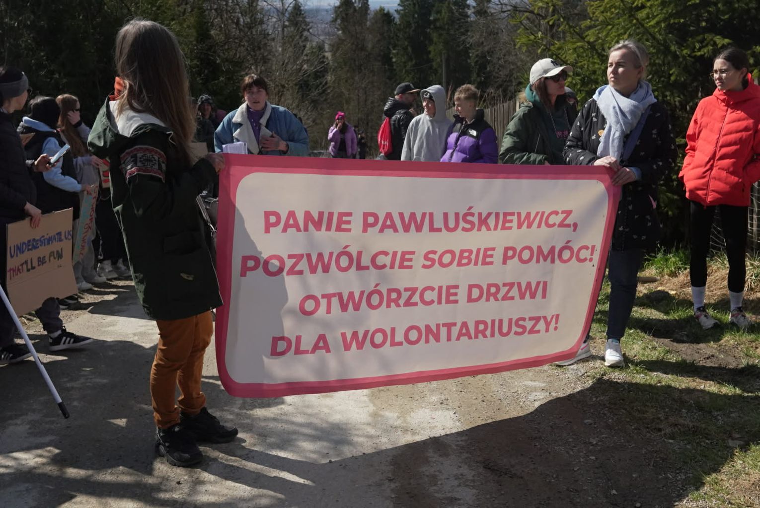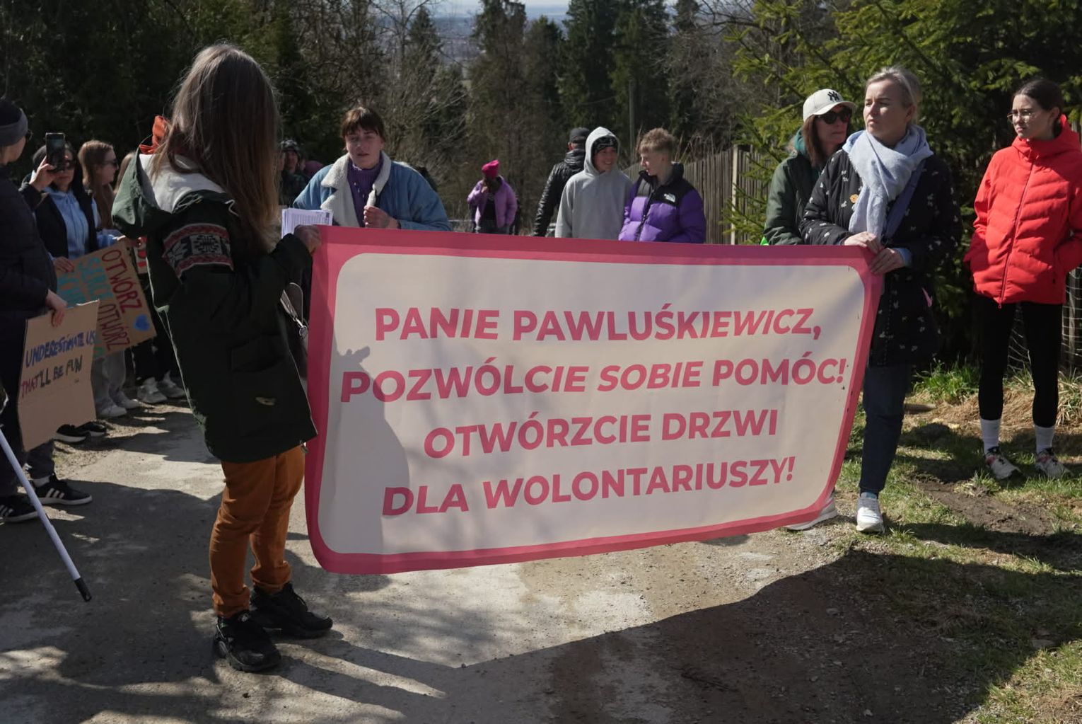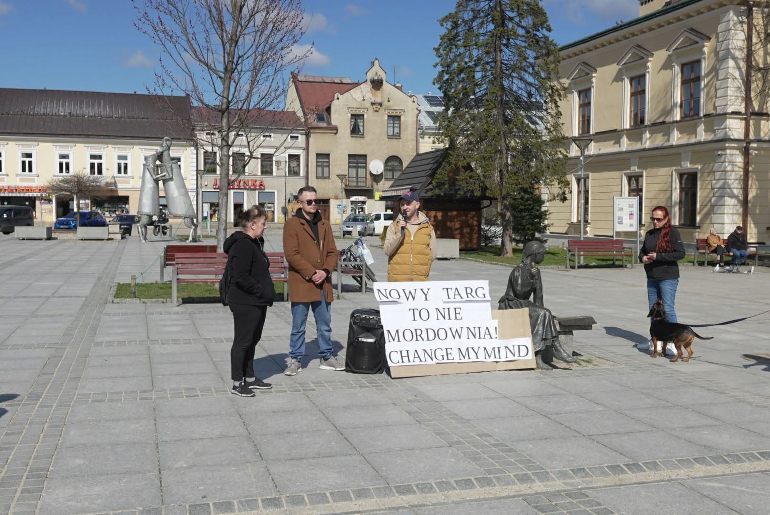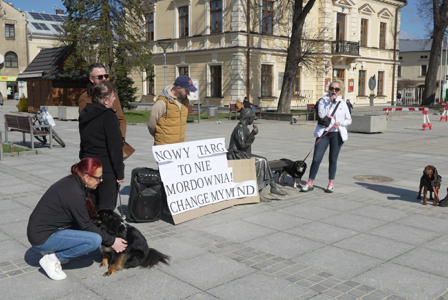 Równolegle do wydarzeń na Kokoszkowie, na nowotarskim Rynku zebrała się grupa osób o zupełnie innym spojrzeniu na sytuację. Manifestacja zorganizowana przez Krzysztofa Pierchlaka miała na celu obronę dobrego imienia rodziny Pawluśkiewiczów oraz sprzeciw wobec fali hejtu, która w ostatnim czasie zalała internet. Uczestnicy tego wiecu, często przychodzący ze swoimi psami adoptowanymi właśnie z tego schroniska, przekonywali, że opinie krążące w sieci są niesprawiedliwe i krzywdzące dla ludzi, którzy od lat oddają serce opiece nad zwierzętami.
