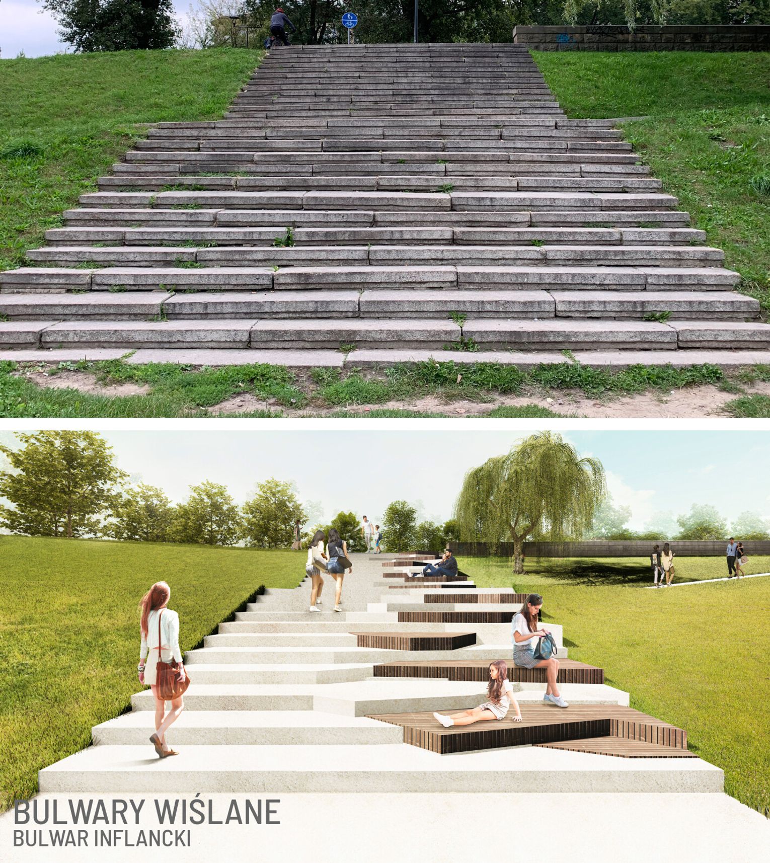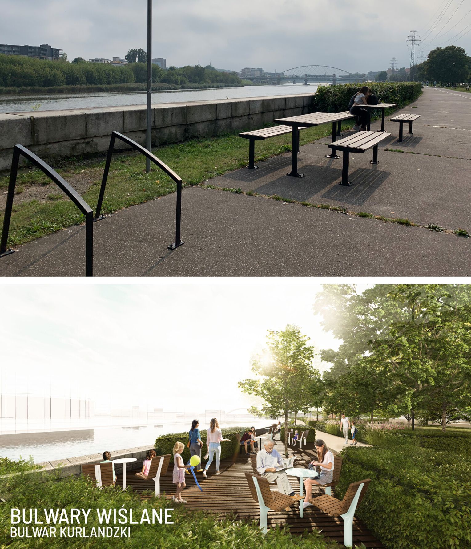Projektanci przewidzieli również zmianę lokalizacji małej architektury, tak aby ławki znajdowały się bezpośrednio przy ciągach pieszych, a nie jak dotychczas w bezpośrednim sąsiedztwie ścieżek rowerowych. Komfort osób o ograniczonej mobilności oraz rodziców z wózkami poprawią nowe, gładkie najazdy, które zastąpią dotychczasowe, często strome i nierówne zjazdy na niższe poziomy bulwarów. Całość uzupełni starannie dobrana dodatkowa zieleń, która podkreśli parkowy charakter nabrzeża i zwiększy estetykę całego otoczenia rzeki.