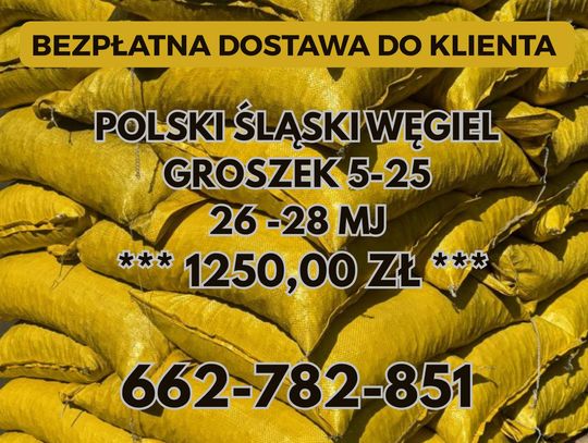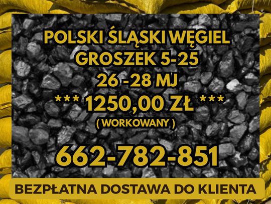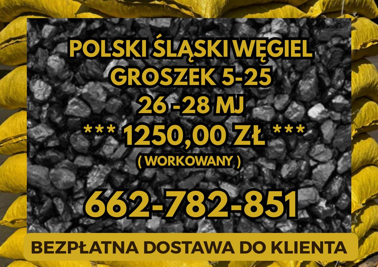 *** POLSKI ŚLASKI WEGIEL - WĘGIEL GROSZEK (EKOGROSZEK) *** POLSKI WĘGIEL : GROSZEK ( 5-25 ) 26-28MJ ( WORKOWANY , Paleta - 40 X 25 KG ) CENA : 1250 zł/t ZAMÓW : 662782851 www.polskislaskiwegiel.olx.pl BEZPŁATNA DOSTAWA DO KLIENTA - TRANSPORT GRATIS ! - WYSOKOKALORYCZNY - NISKI POPIÓŁ - NIE SPIEKA SIE - BEZ MIAŁU - PALETA BEZZWROTNA - ROŁADUNEK WINDA LUB HDS Szybki termin realizacji, bezpłatna dostawa do Klienta !!!